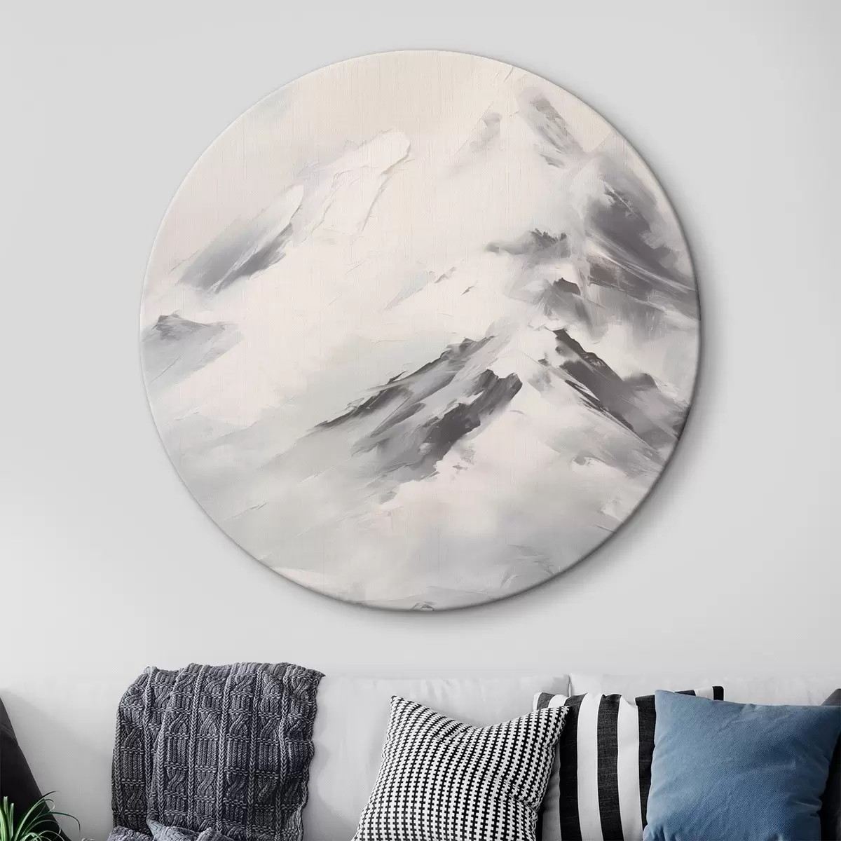 Tableaux rondes Sommets enneigés avec des ombres grises, ciel gris, coups de pinceau, texturé, minimaliste Nr r45932
