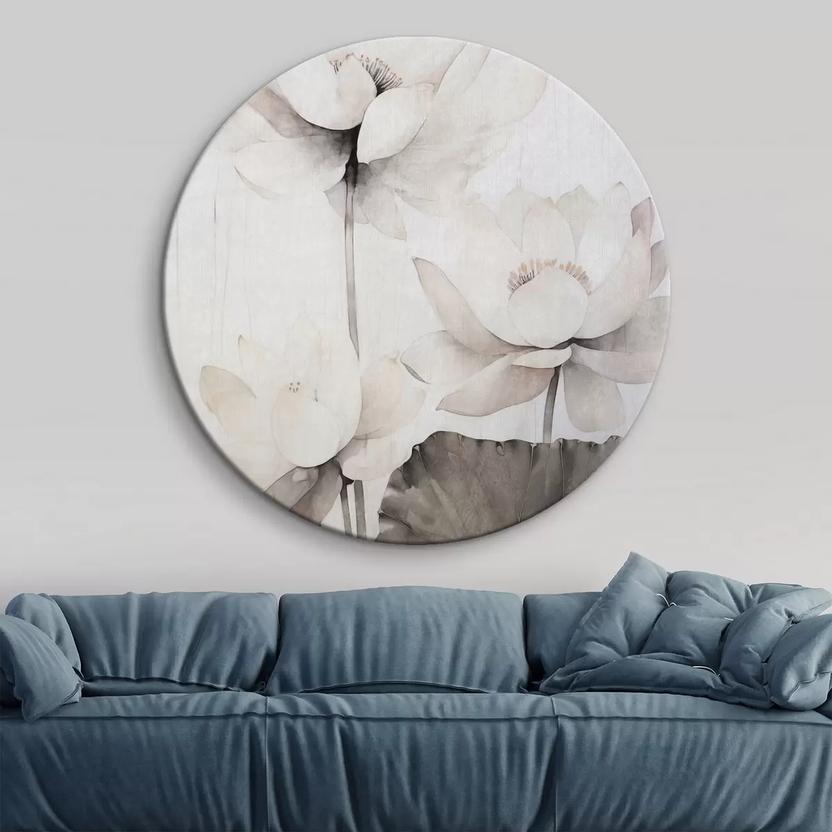 Tableaux rondes Fleurs de lotus blanches texturées avec des feuilles foncées, fond clair, design minimaliste Nr r45936