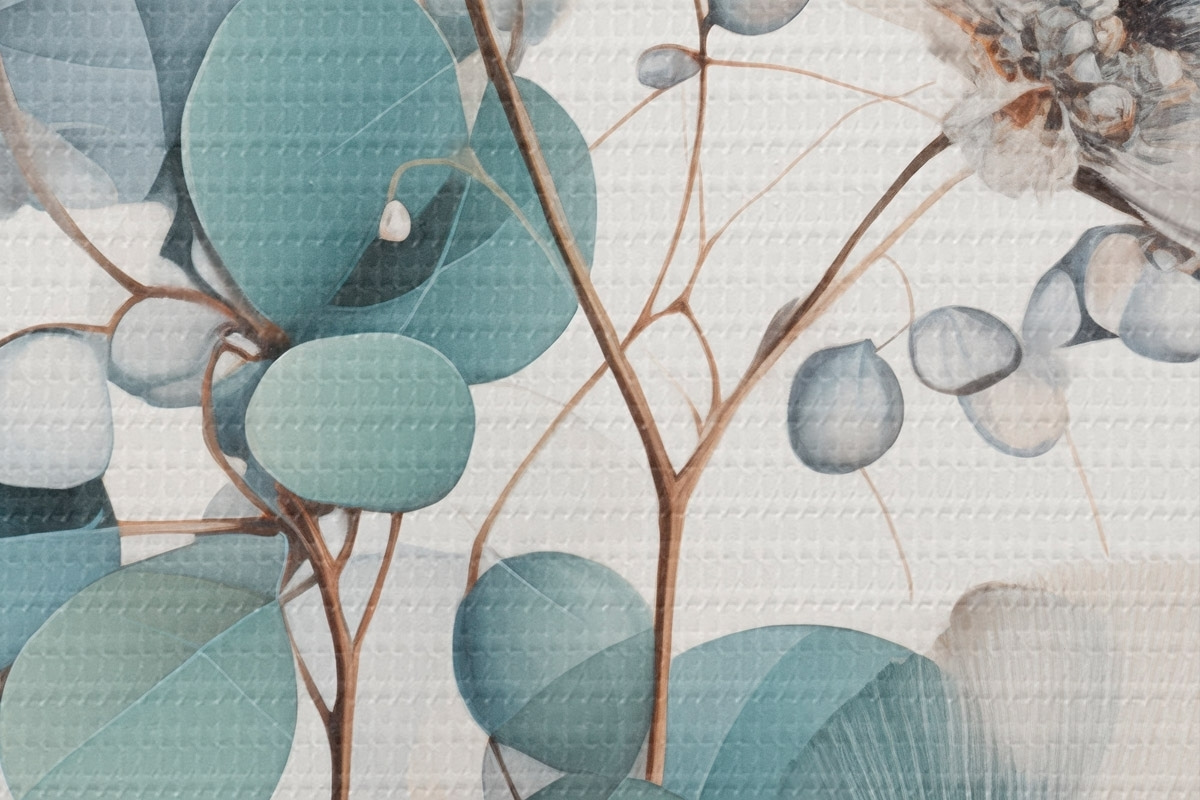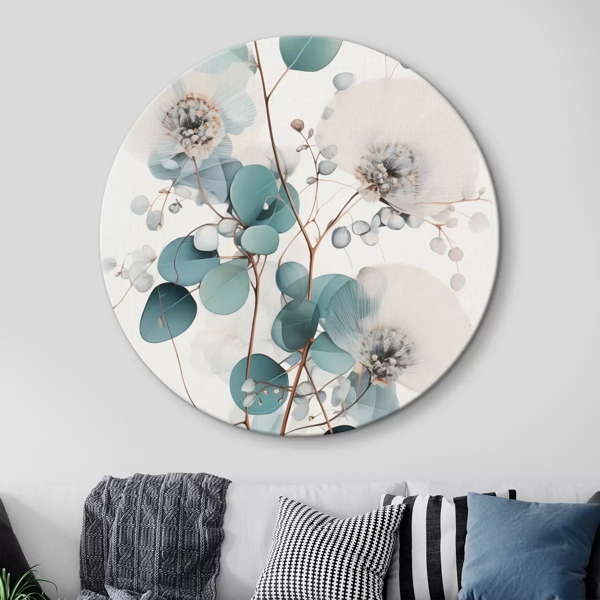 Tableaux rondes Fleurs abstraites d'eucalyptus aux pétales blancs, feuilles vert pâle sur les branches Nr r45946