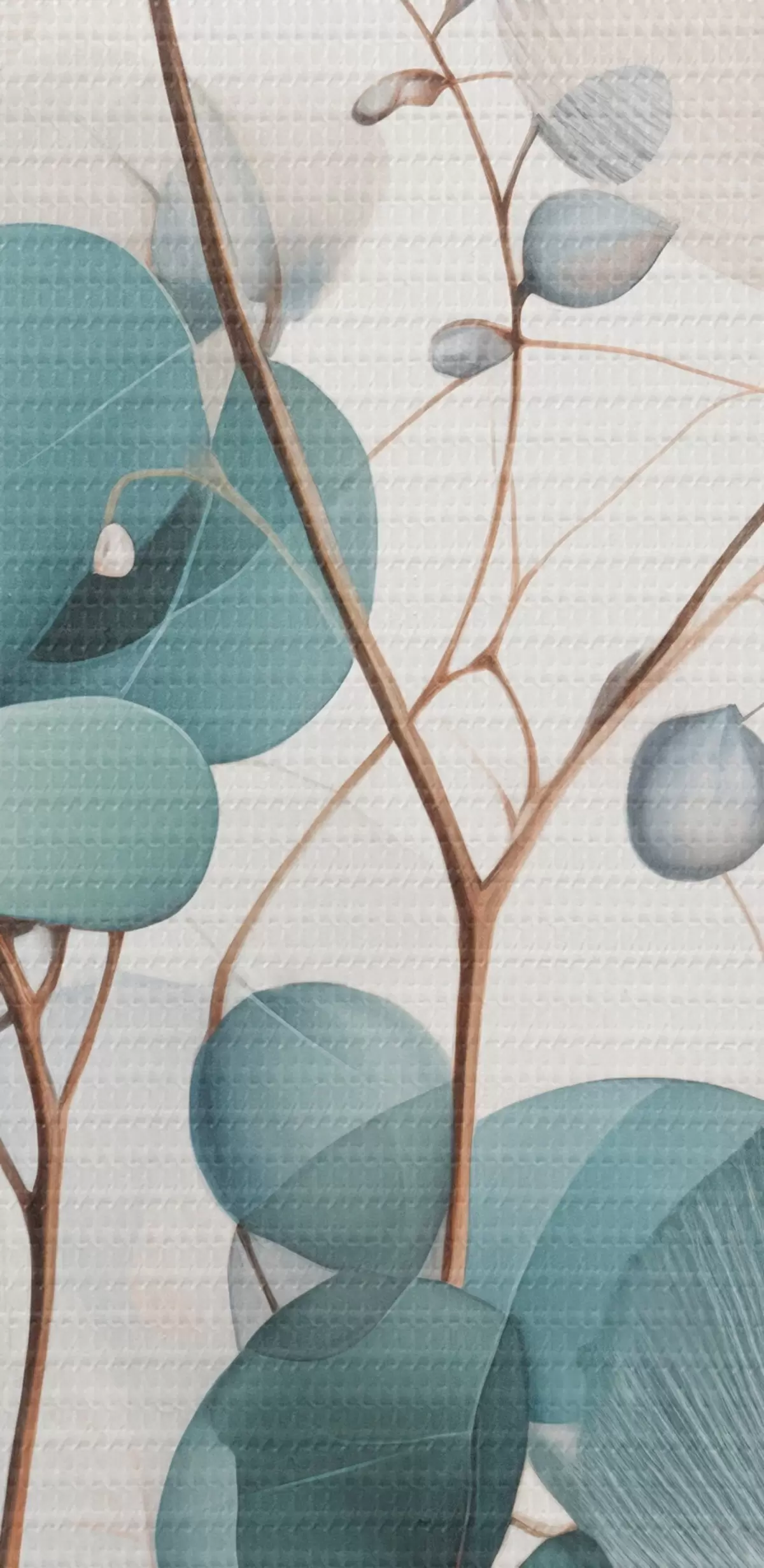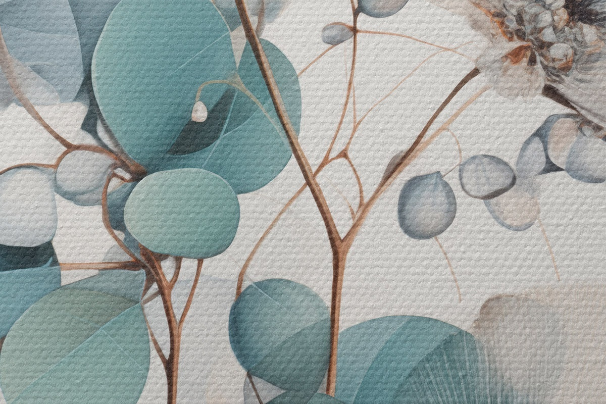 Tableaux rondes Fleurs abstraites d'eucalyptus aux pétales blancs, feuilles vert pâle sur les branches r45946