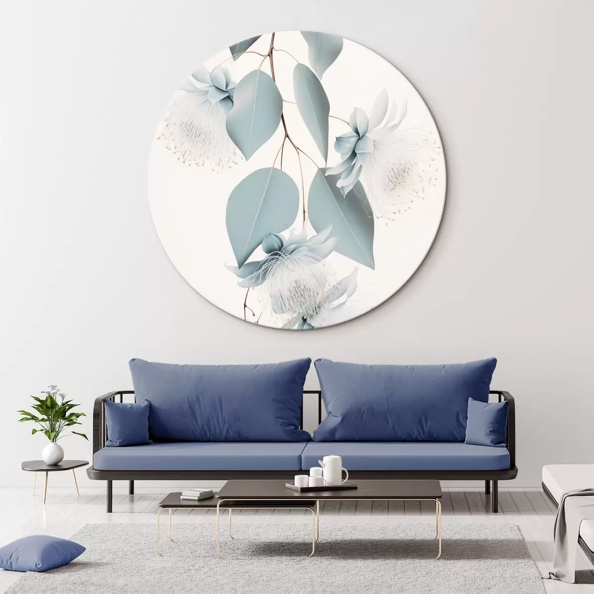 Tableaux rondes Branche d'eucalyptus avec des feuilles bleues et des fleurs blanches, fond clair r45947