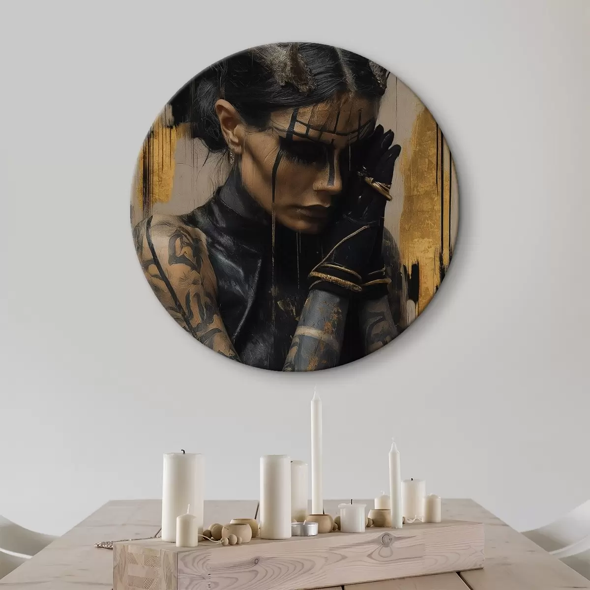 Tableaux rondes Femme avec des cornes, au regard sombre et au visage marqué de rides noires Nr r46144