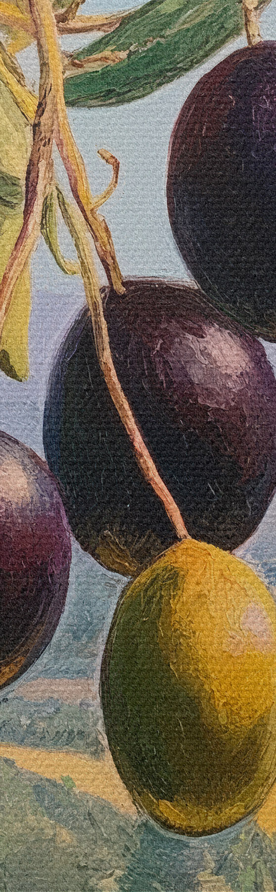 Tableaux rondes Branche d'olivier avec des fruits noirs sur fond de paysage estival Nr r46150