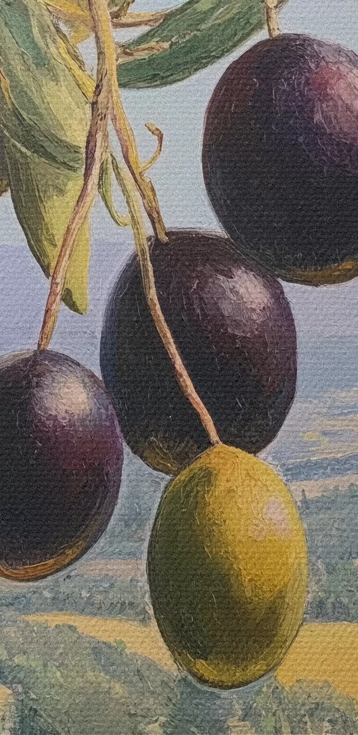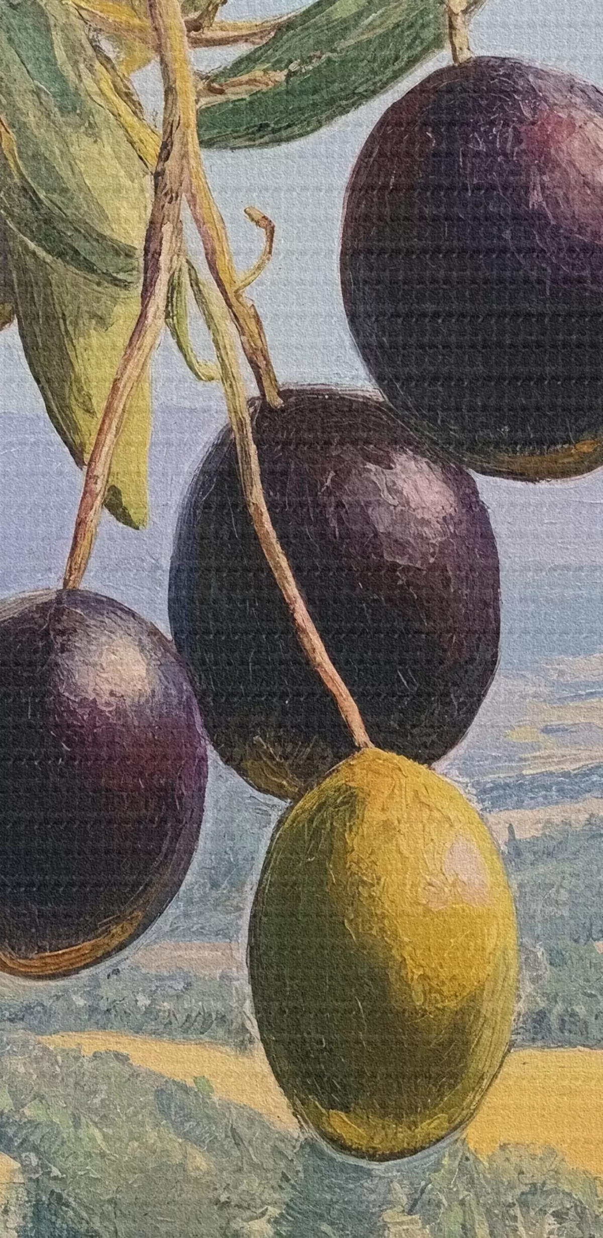 Tableaux rondes Branche d'olivier avec des fruits noirs sur fond de paysage estival Nr r46150