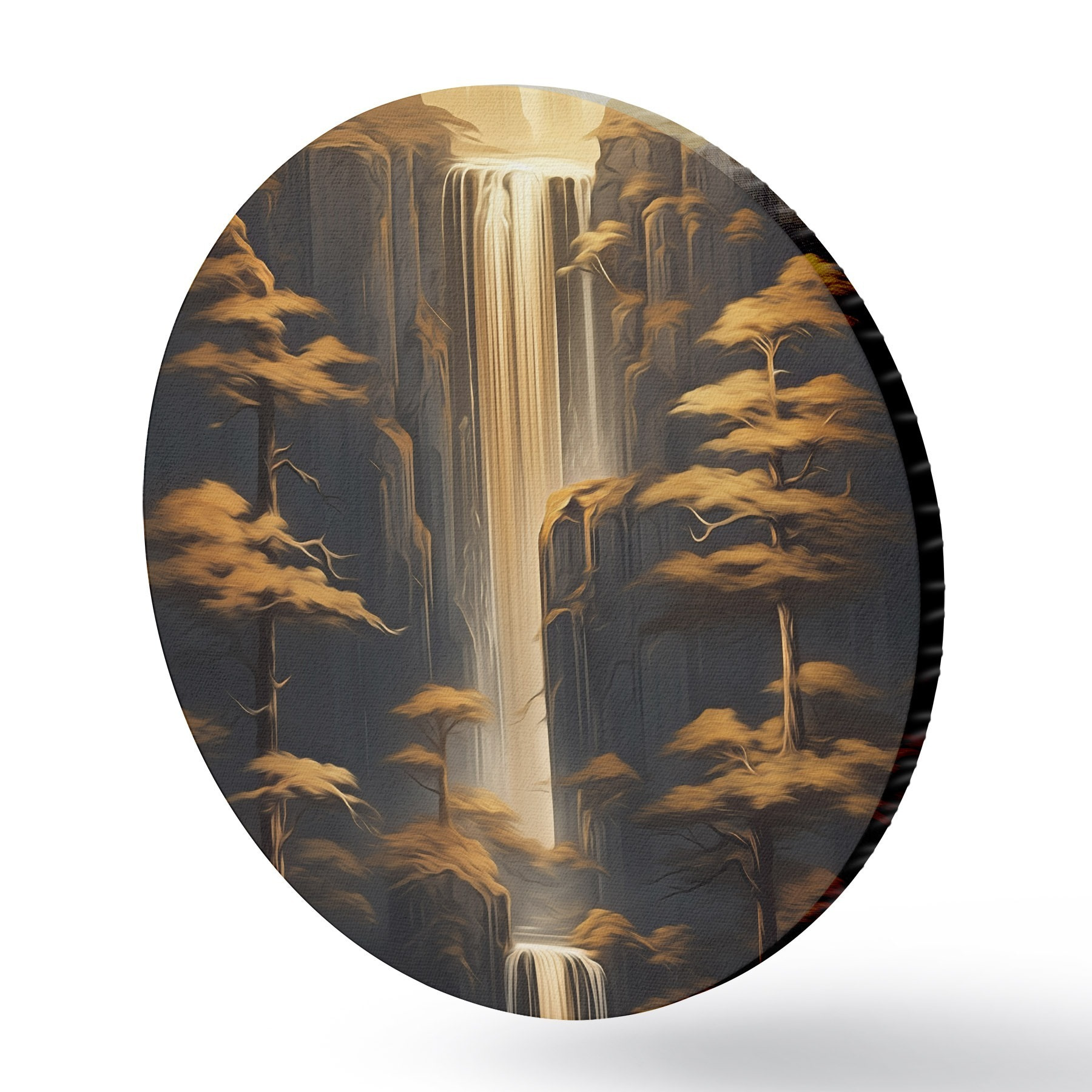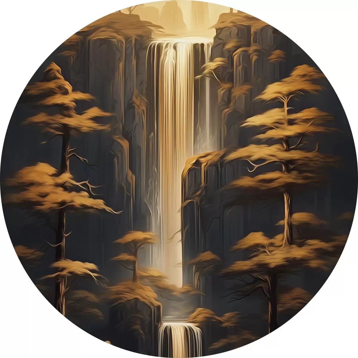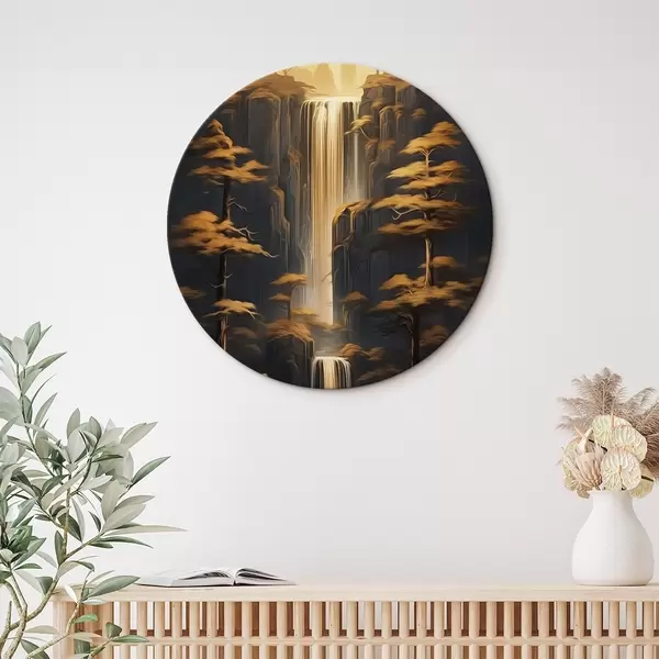 Tableaux rondes Hautes falaises avec une cascade et des pins dans la lumière du soir Nr r46151