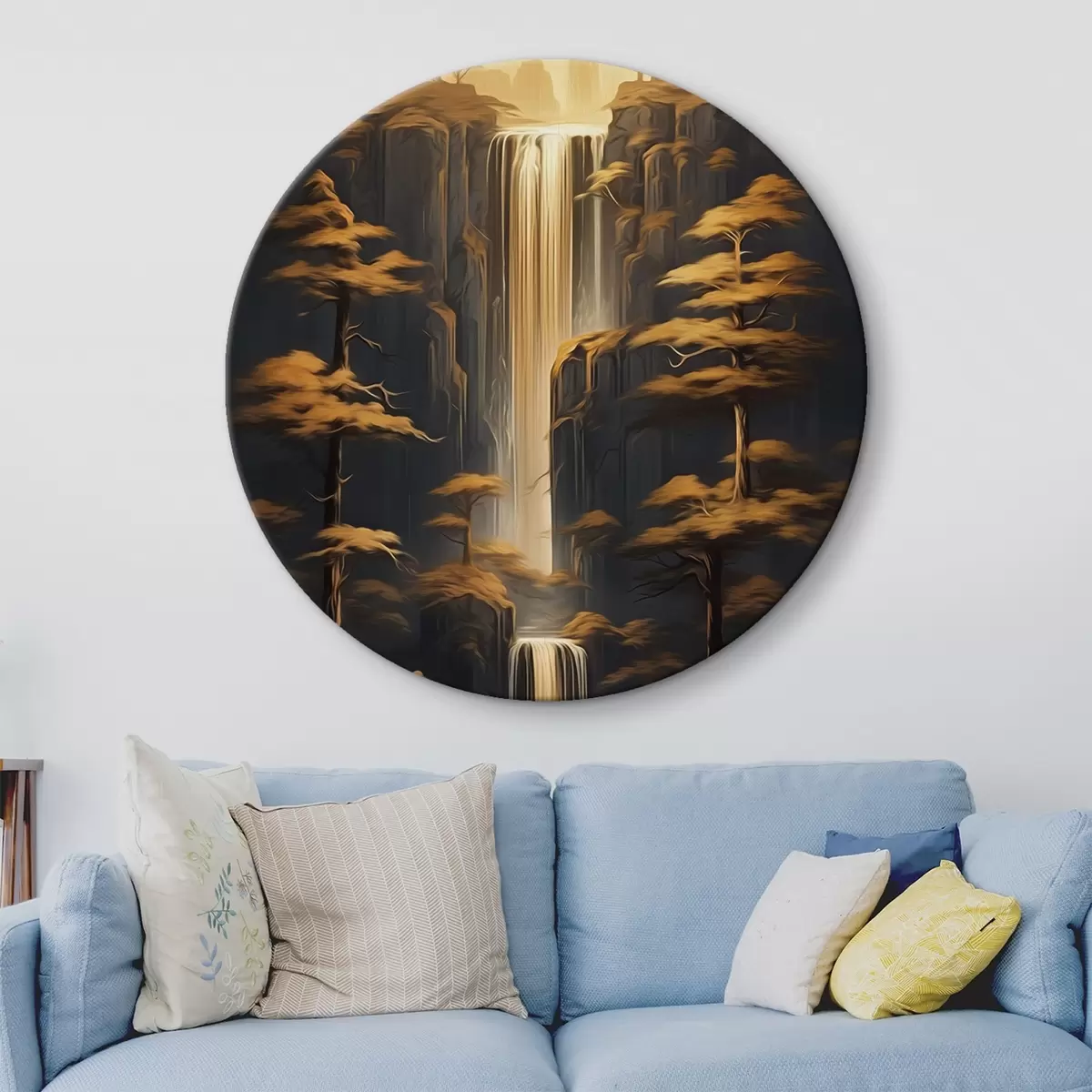 Tableaux rondes Hautes falaises avec une cascade et des pins dans la lumière du soir Nr r46151