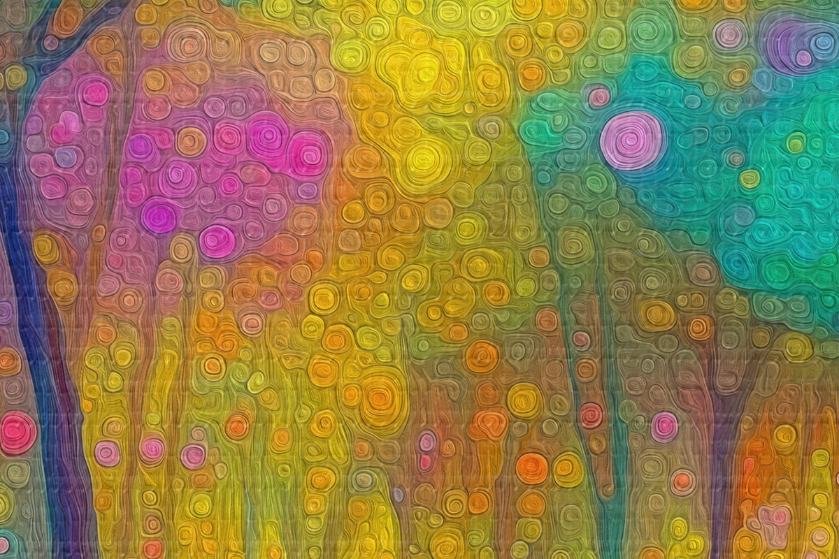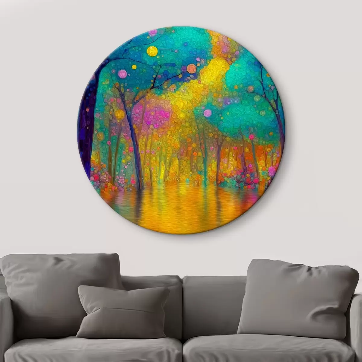 Tableaux rondes Forêt fantastique aux couleurs vives avec reflets dans l'eau Nr r46171