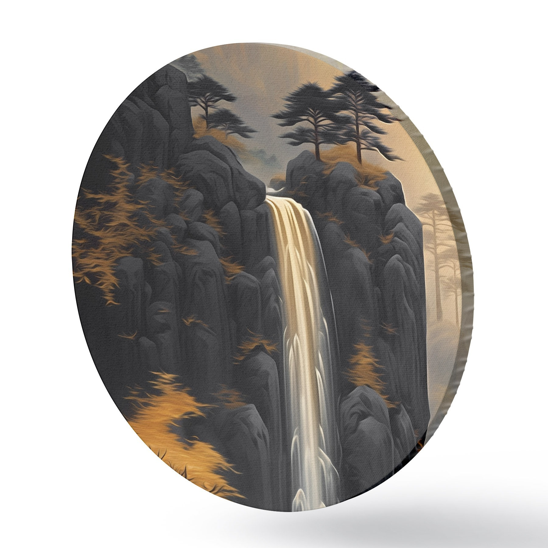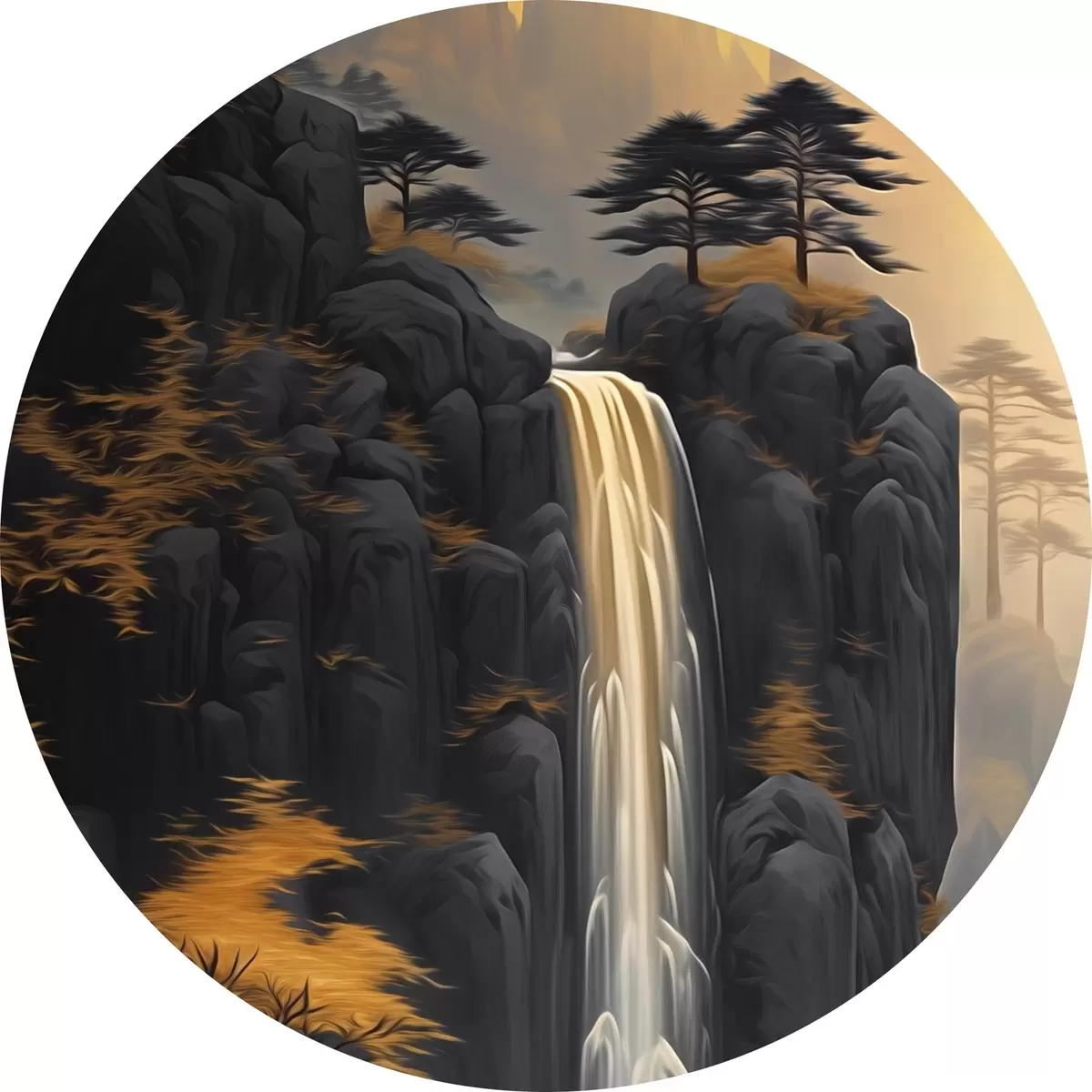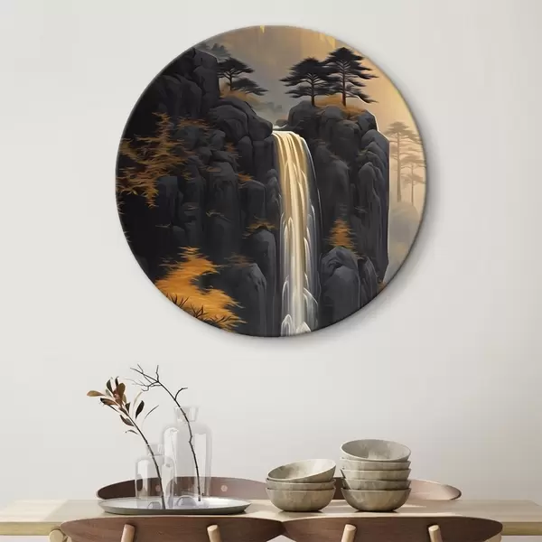 Tableaux rondes Paysage rocheux avec une cascade dans les tons chauds du coucher de soleil r46177