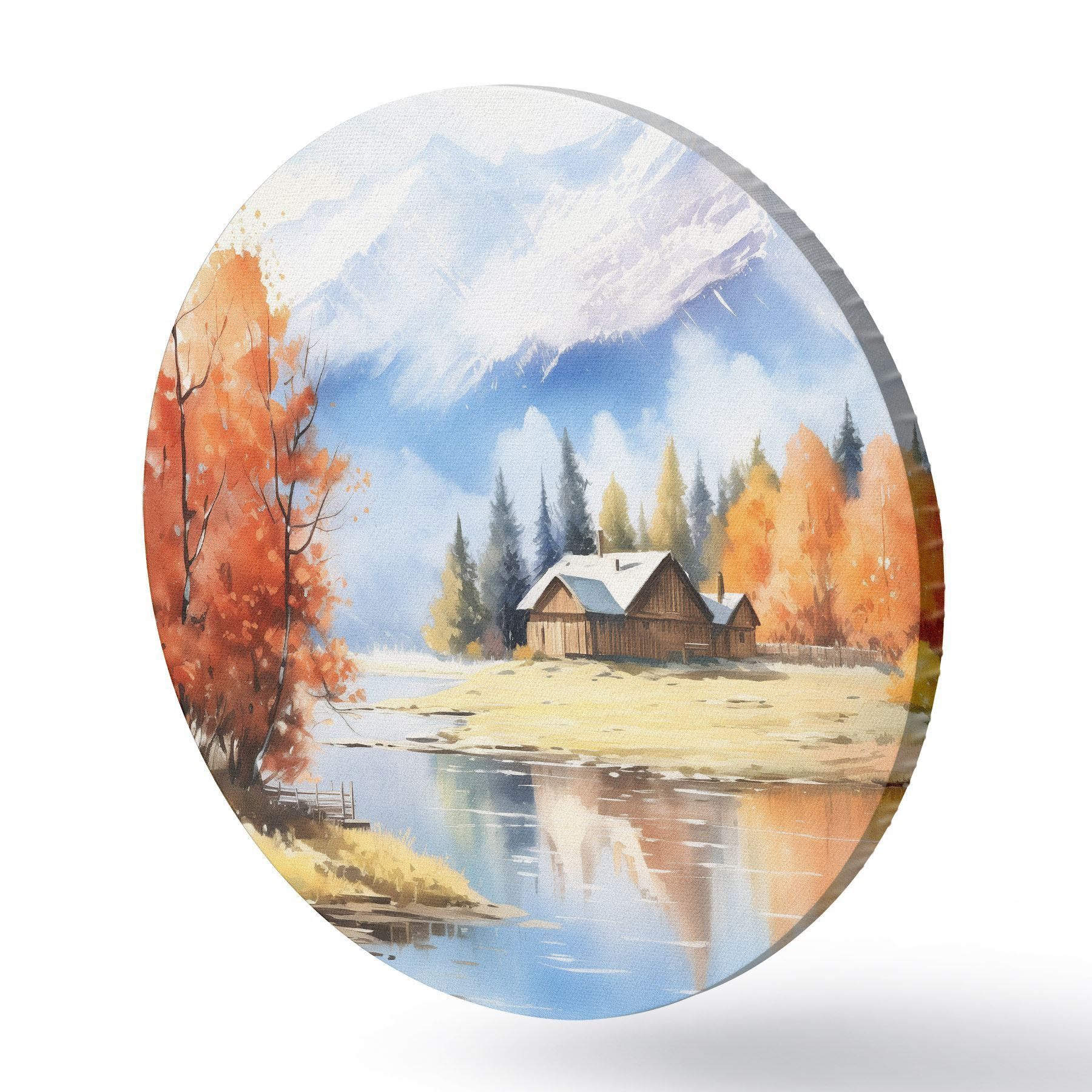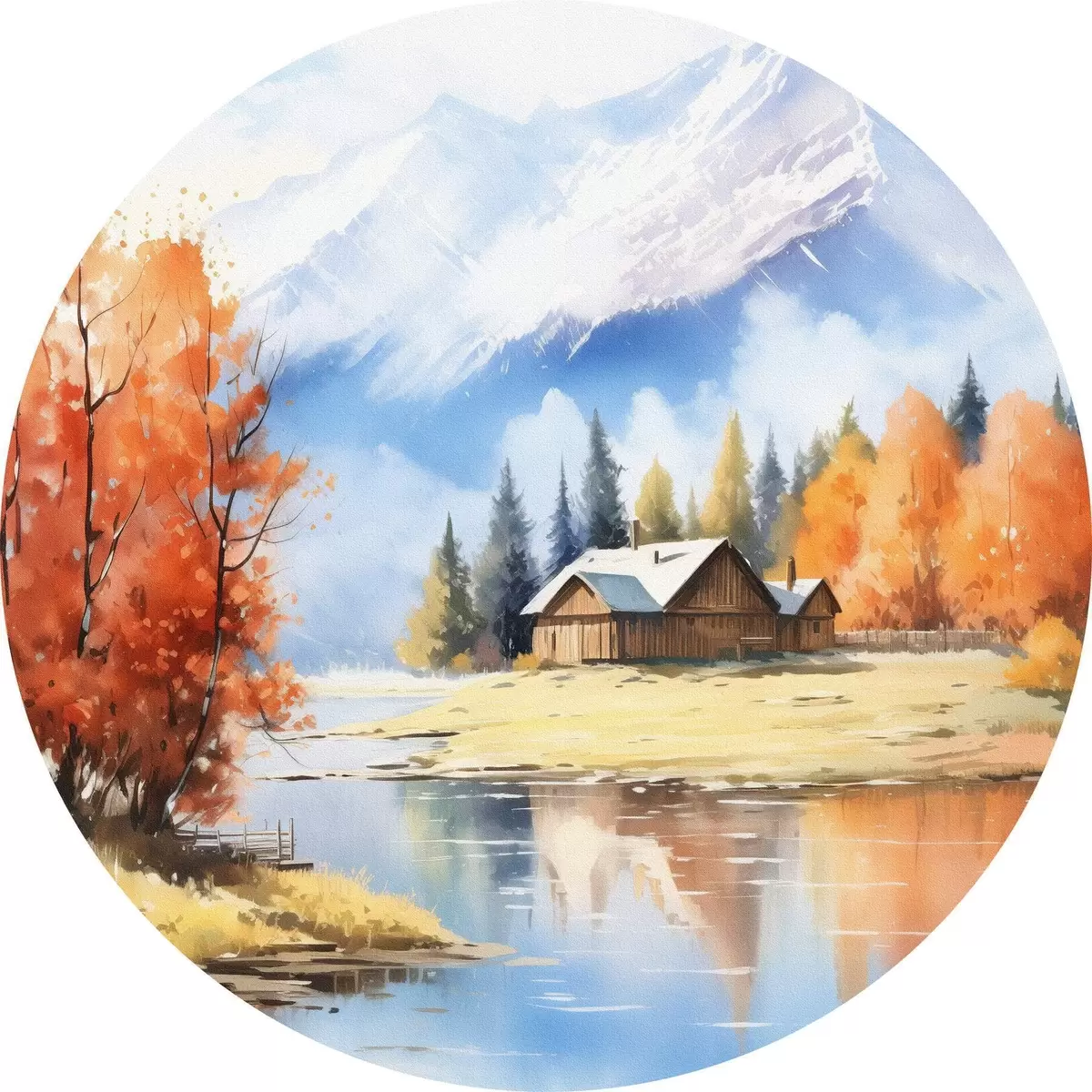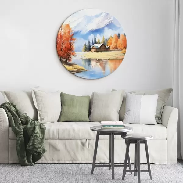 Tableaux rondes Paysage automnal au bord d'un lac avec une maison et des montagnes Nr r46184