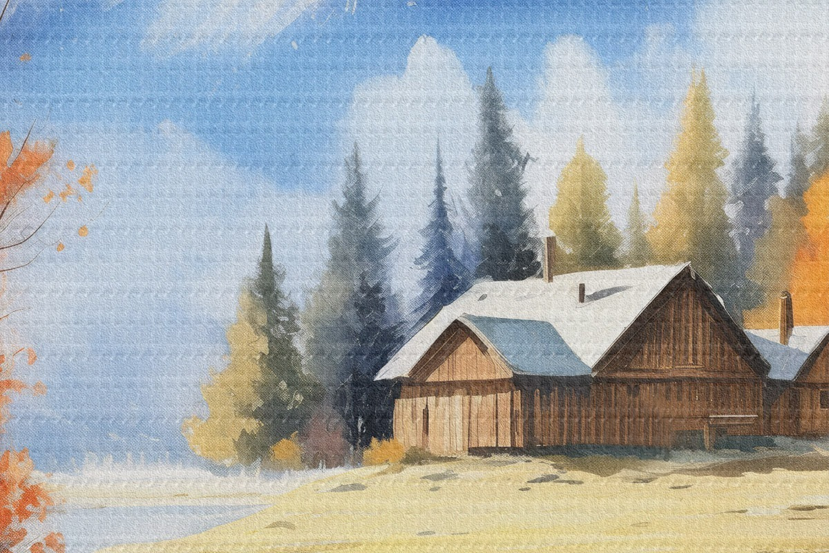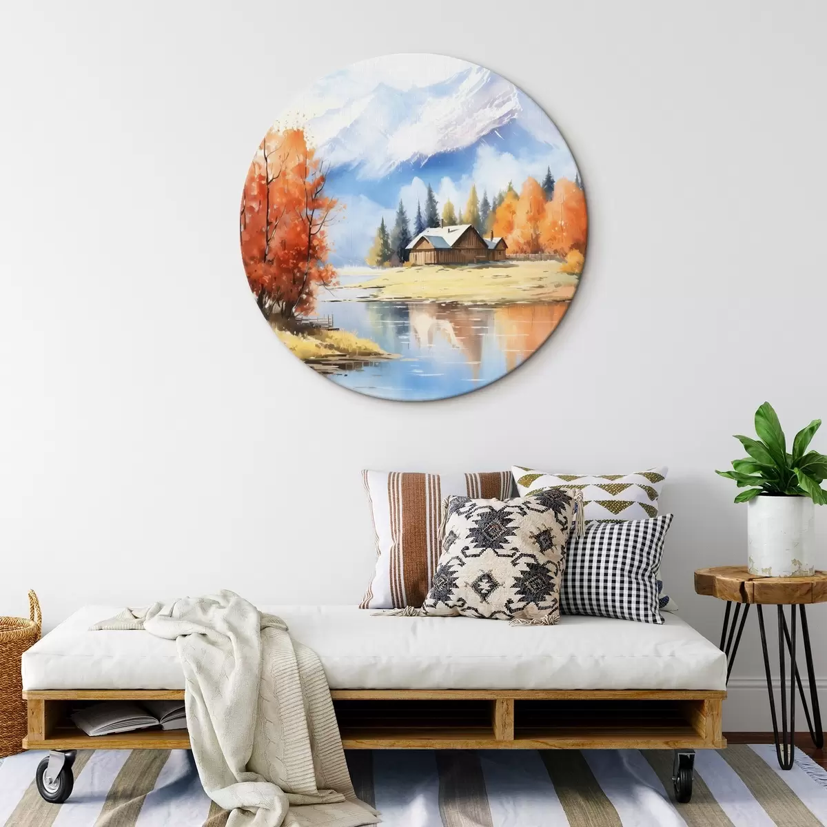 Tableaux rondes Paysage automnal au bord d'un lac avec une maison et des montagnes Nr r46184