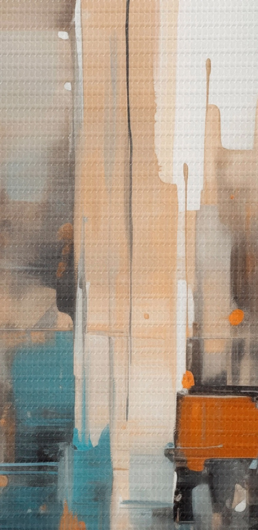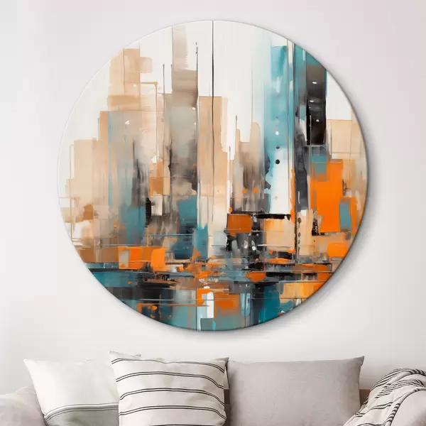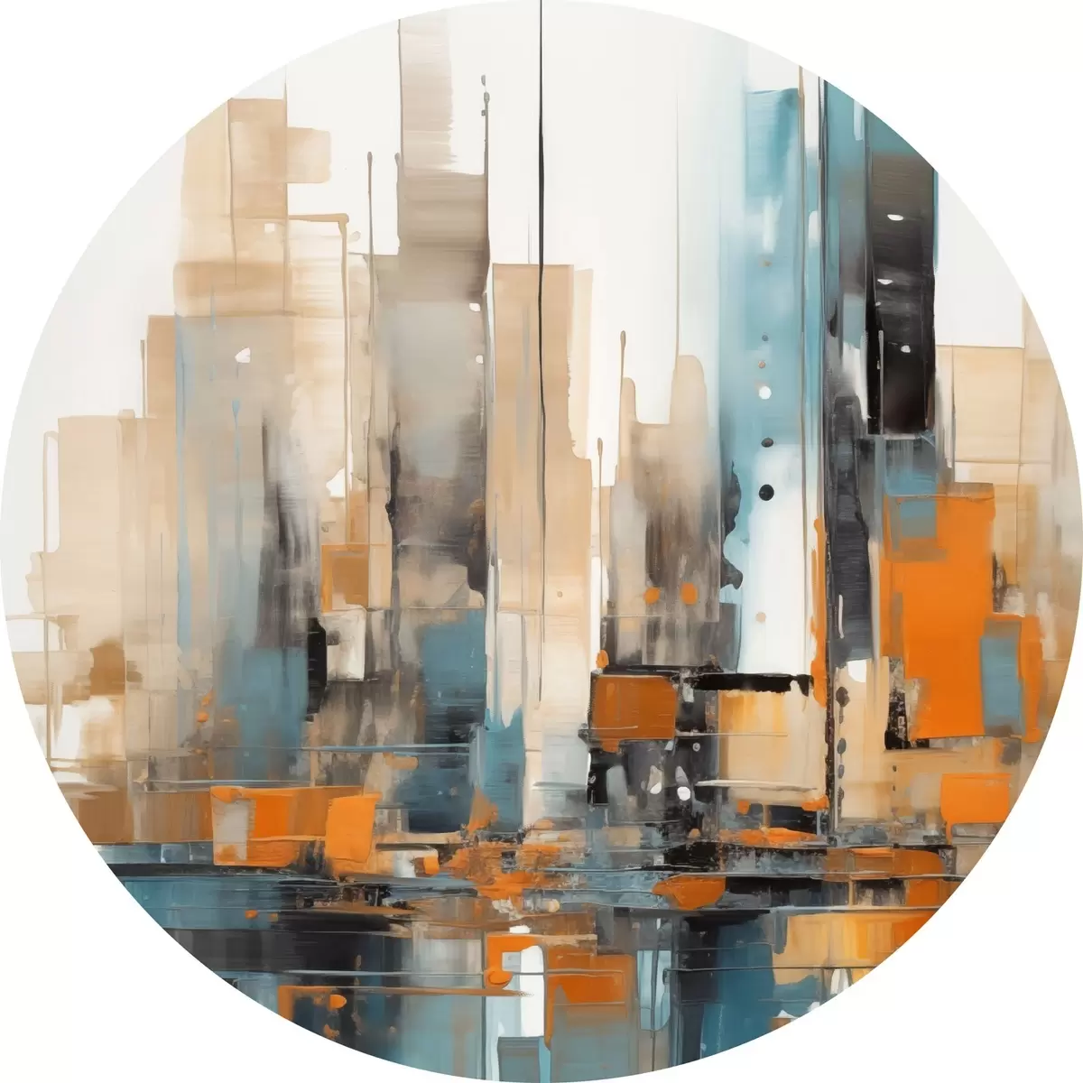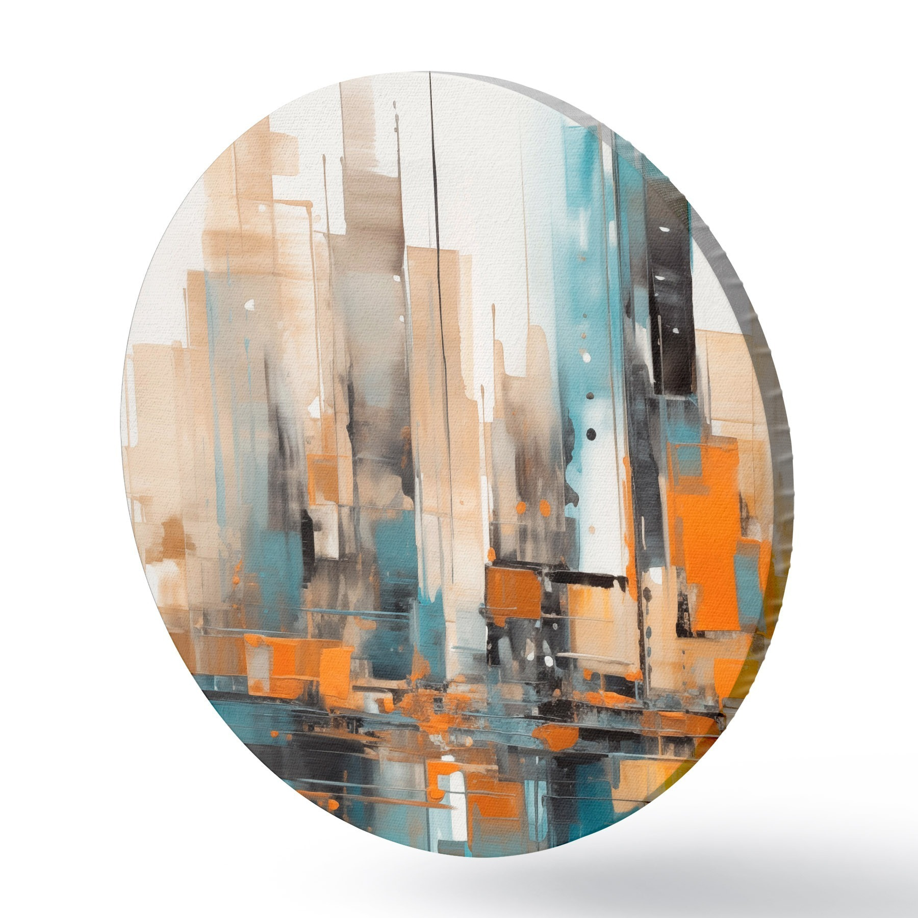 Tableaux rondes Paysage urbain abstrait avec des touches de couleur orange, bleu sarcelle et marron, des coups de pinceau verticaux et des formes géométriques r46266