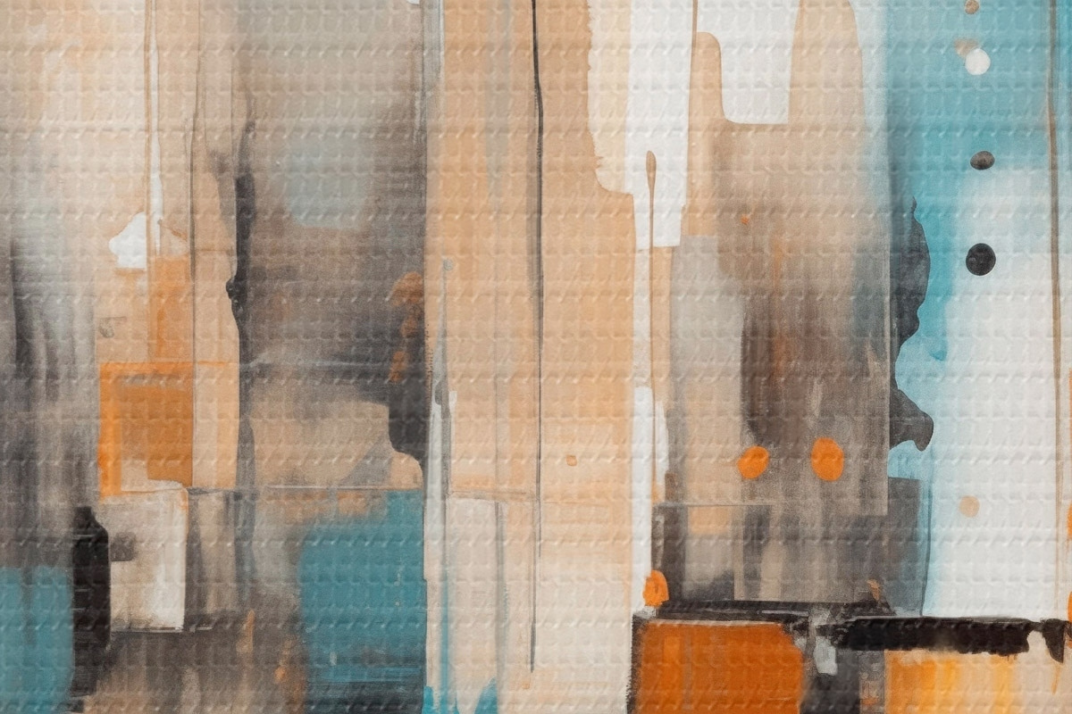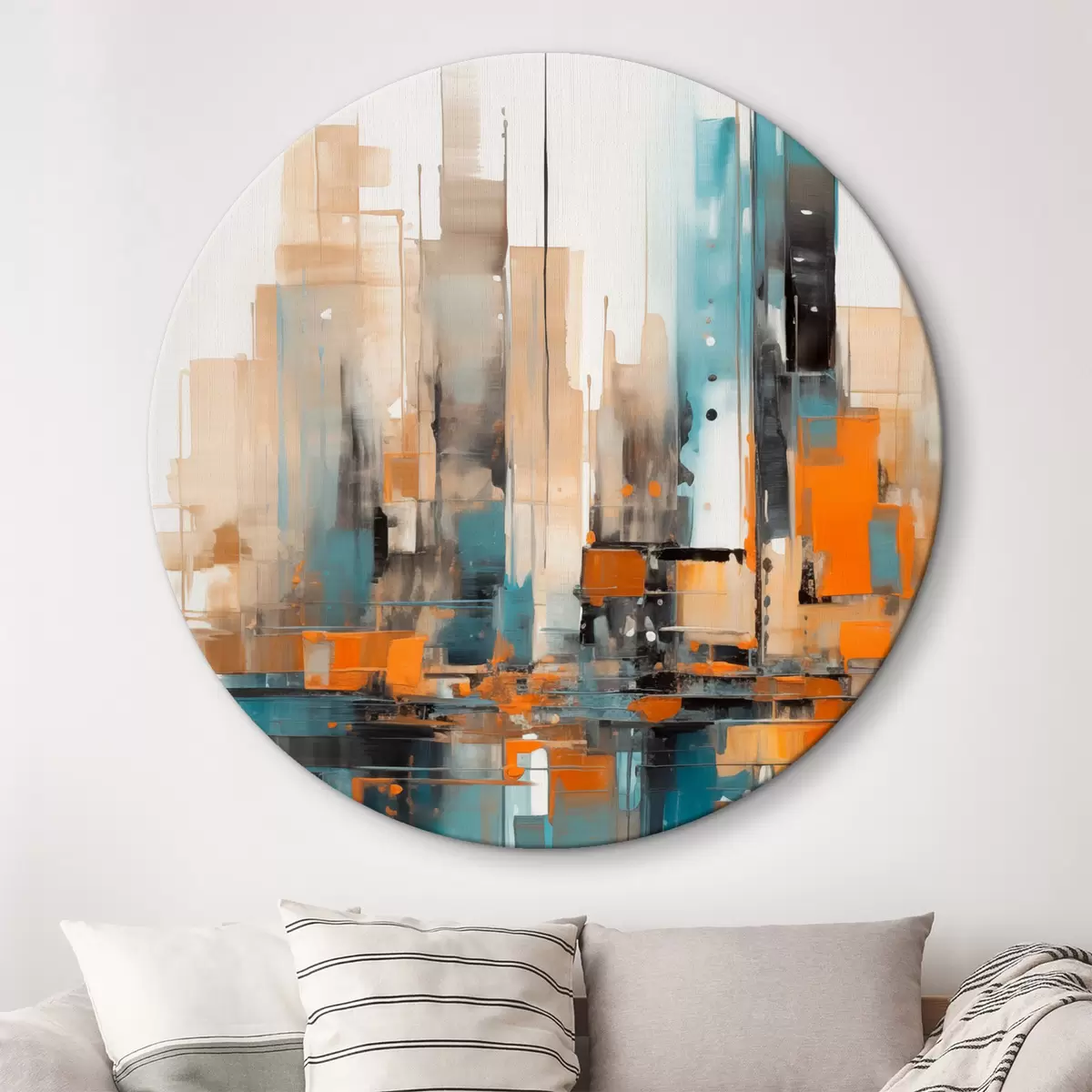 Tableaux rondes Paysage urbain abstrait avec des touches de couleur orange, bleu sarcelle et marron, des coups de pinceau verticaux et des formes géométriques r46266