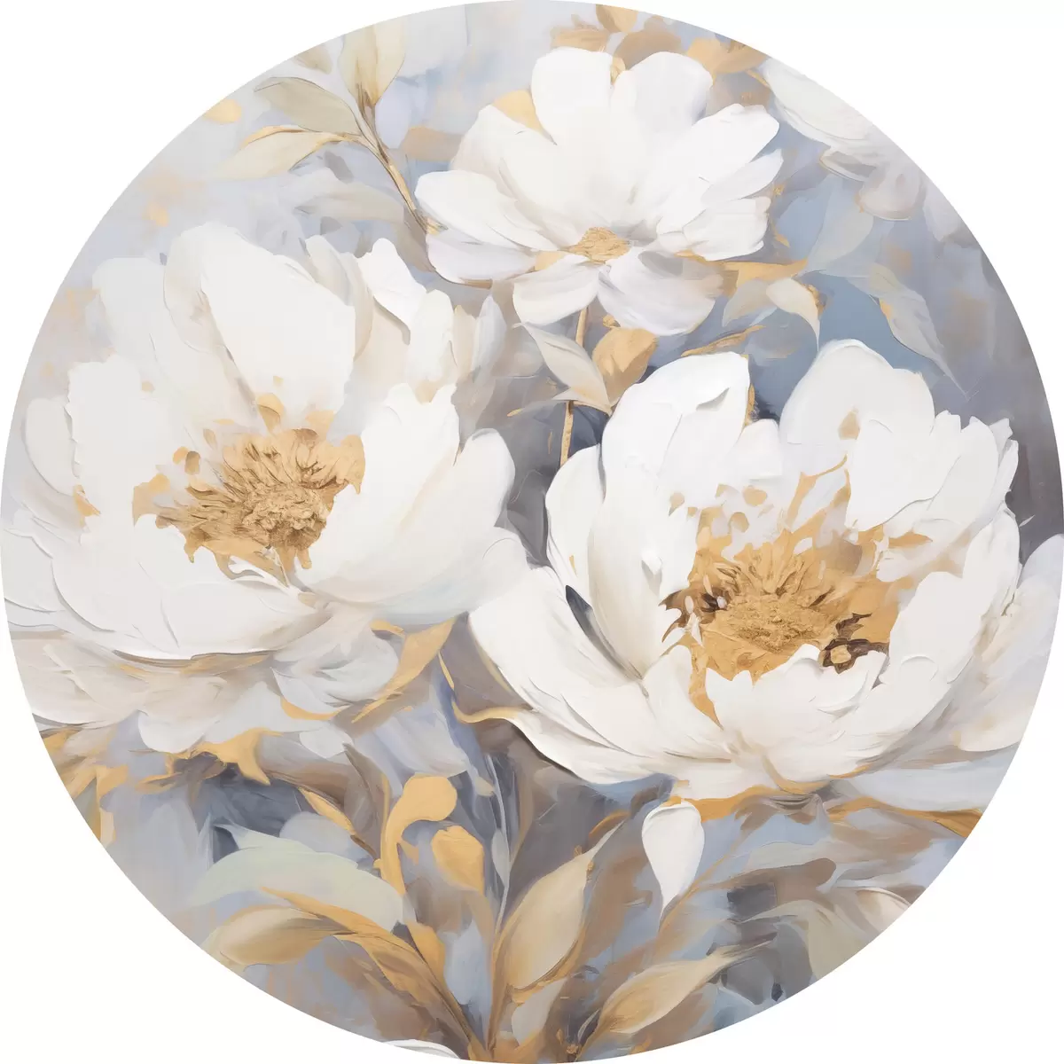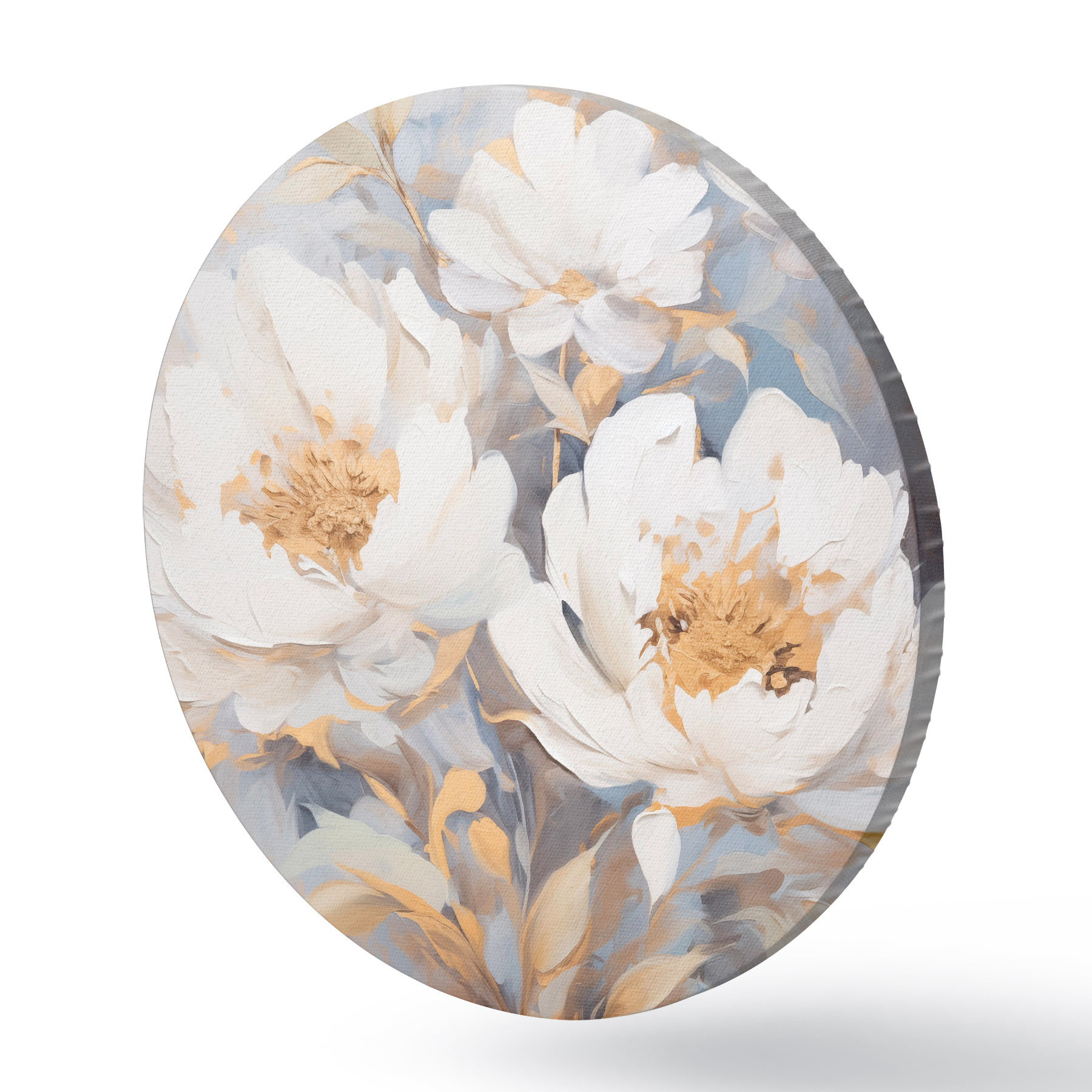 Tableaux rondes Pivoines blanches avec cœur et feuilles bleus, coups de pinceau doux, fond bleu clair, composition florale Nr r46270