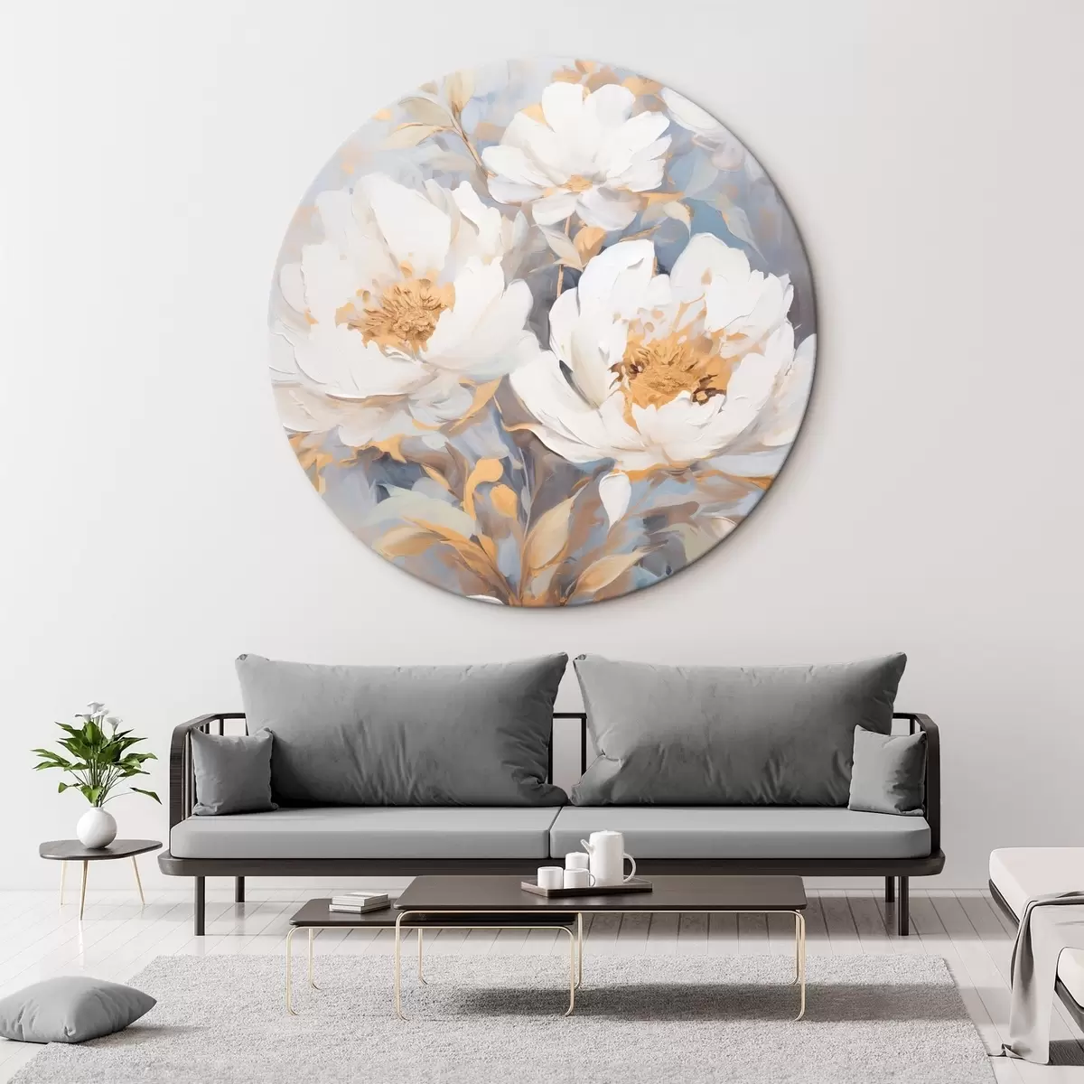 Tableaux rondes Pivoines blanches avec cœur et feuilles bleus, coups de pinceau doux, fond bleu clair, composition florale Nr r46270