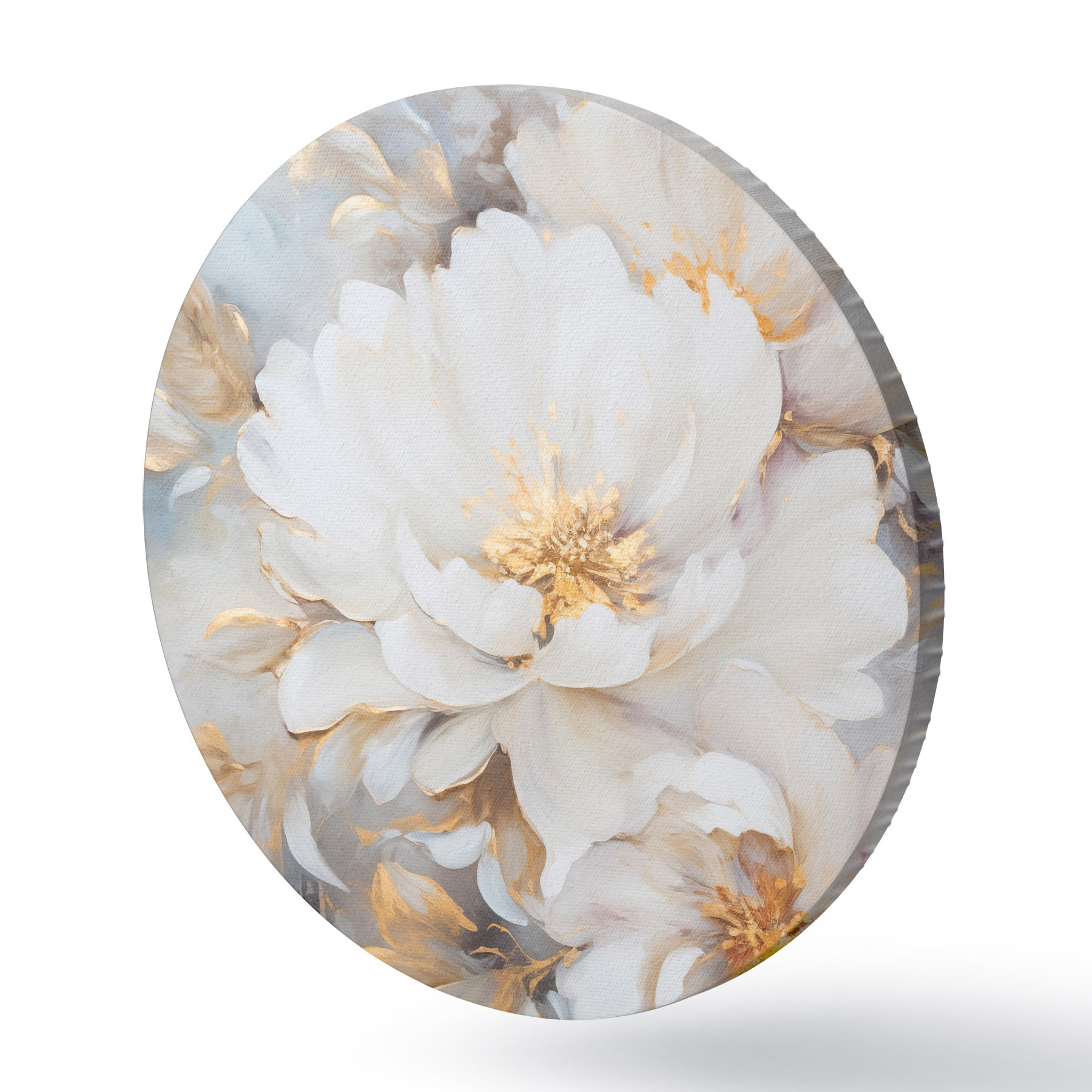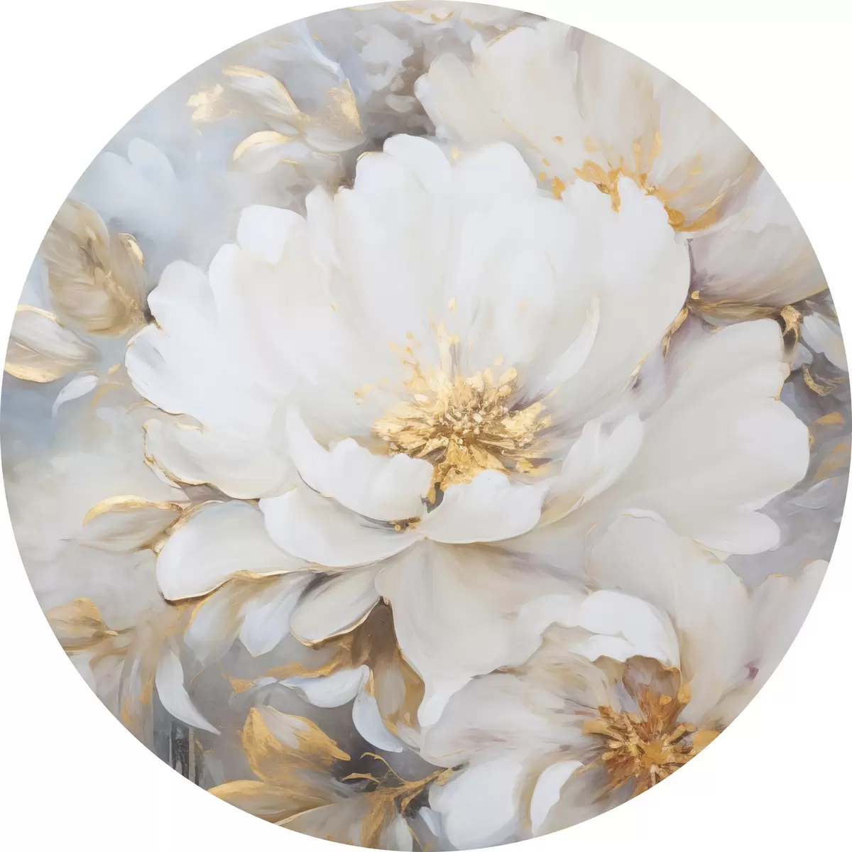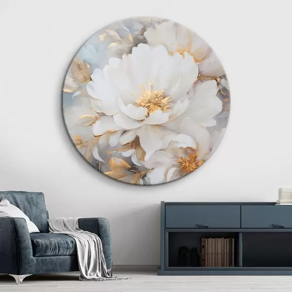 Tableaux rondes Pivoines blanches avec cœur et feuilles bleus, coups de pinceau doux, fond bleu clair, composition florale Nr r46271