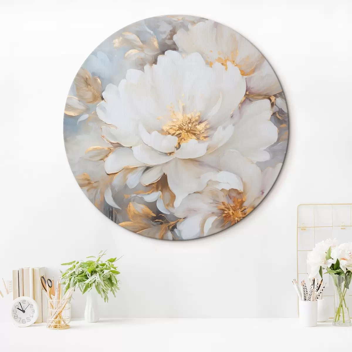 Tableaux rondes Pivoines blanches avec cœur et feuilles bleus, coups de pinceau doux, fond bleu clair, composition florale Nr r46271