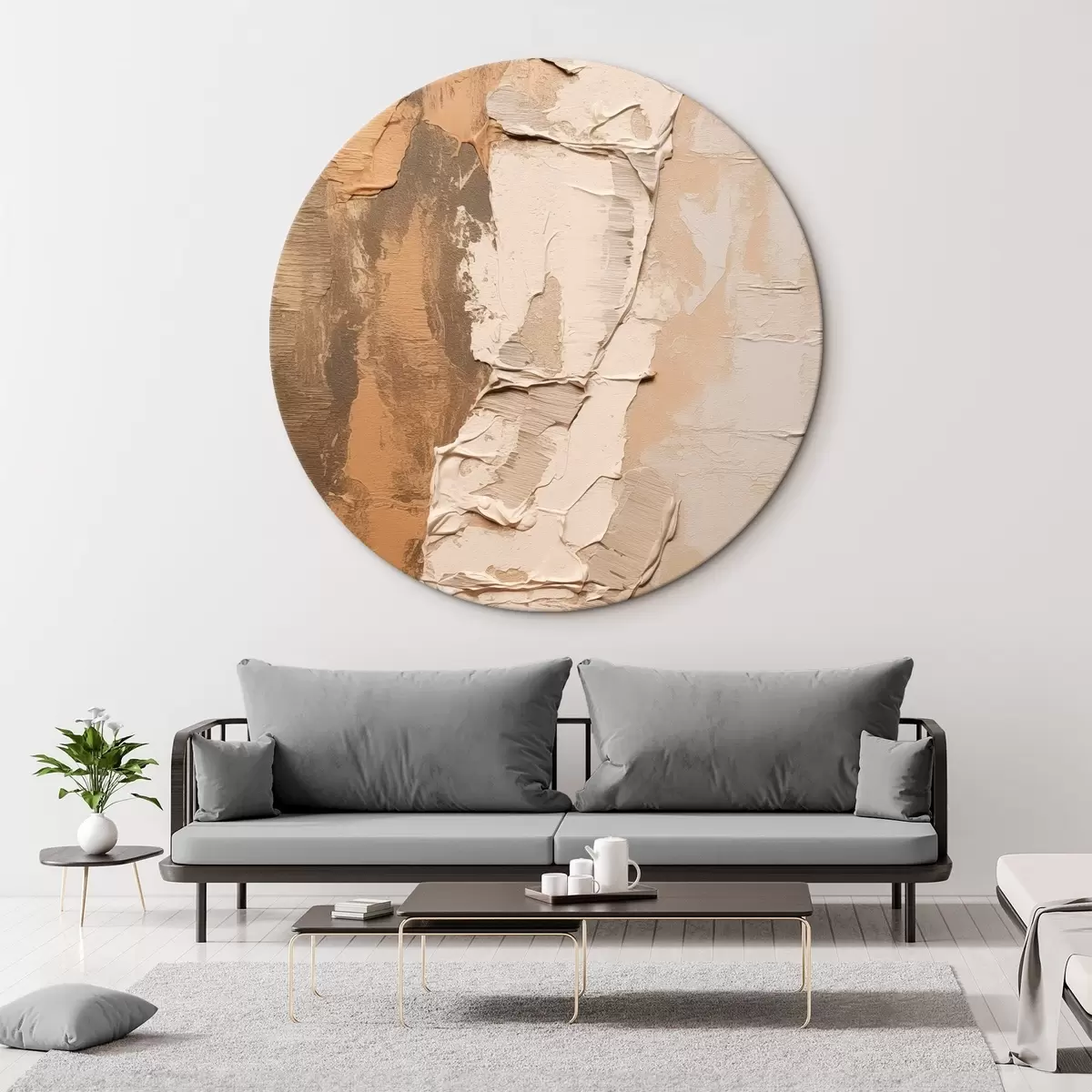 Tableaux rondes Peinture abstraite aux coups de pinceau épais, tons beiges et bruns, surface texturée, palette de couleurs neutres Nr r46272
