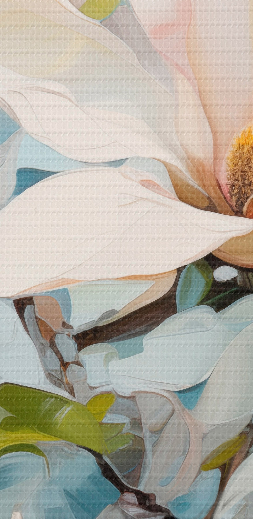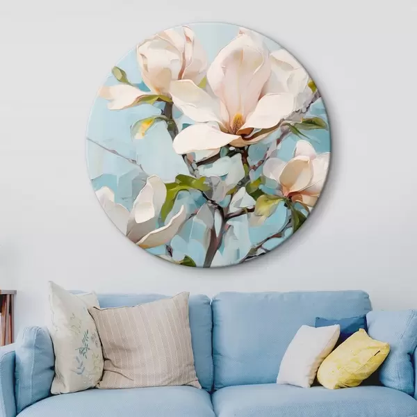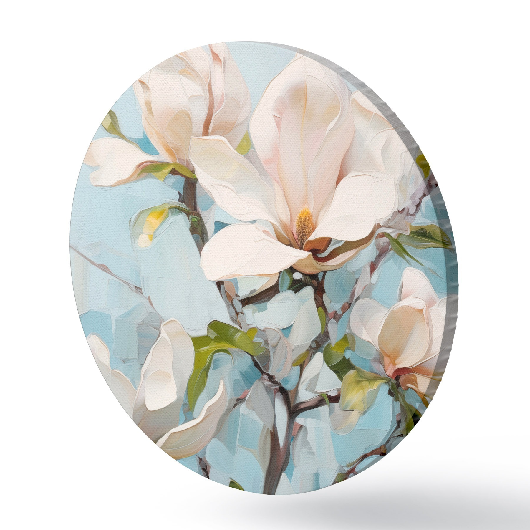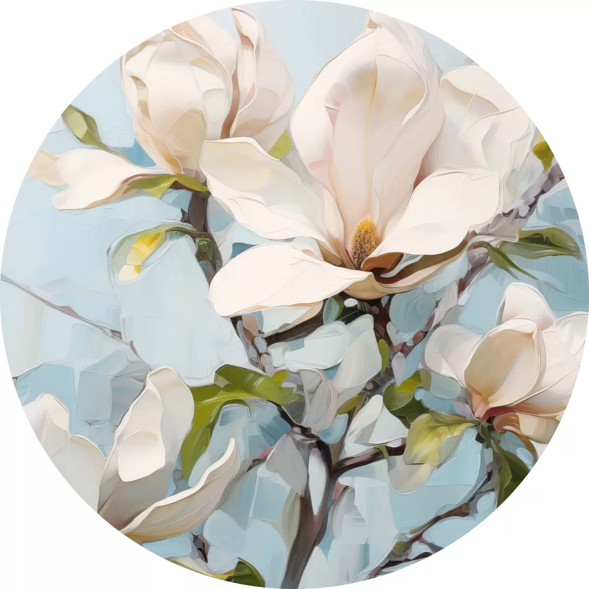 Tableaux rondes Fleurs de magnolia blanches, fond bleu clair avec des coups de pinceau doux, style peinture à l'huile, texture impasto Nr r46277