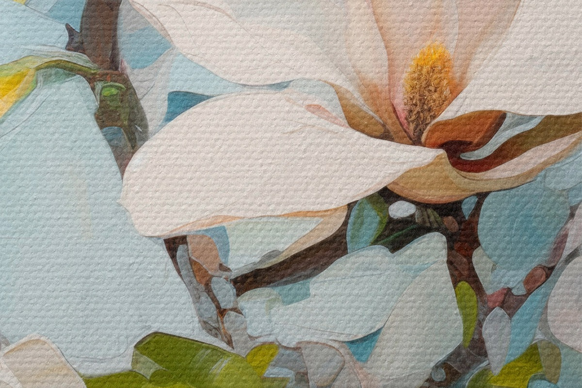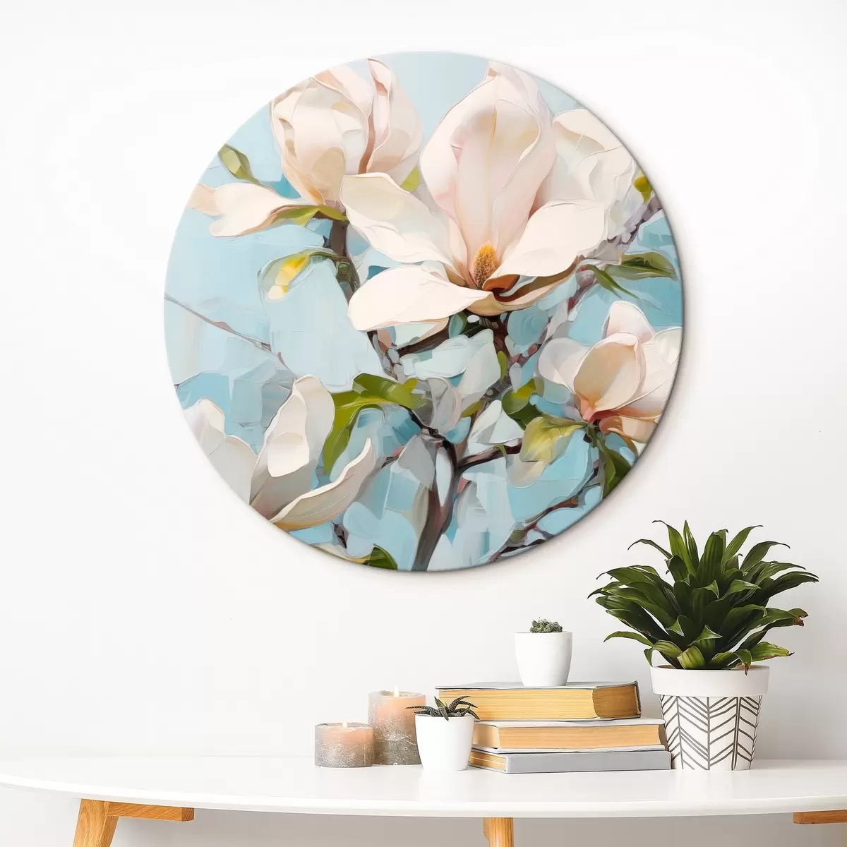 Tableaux rondes Fleurs de magnolia blanches, fond bleu clair avec des coups de pinceau doux, style peinture à l'huile, texture impasto Nr r46277