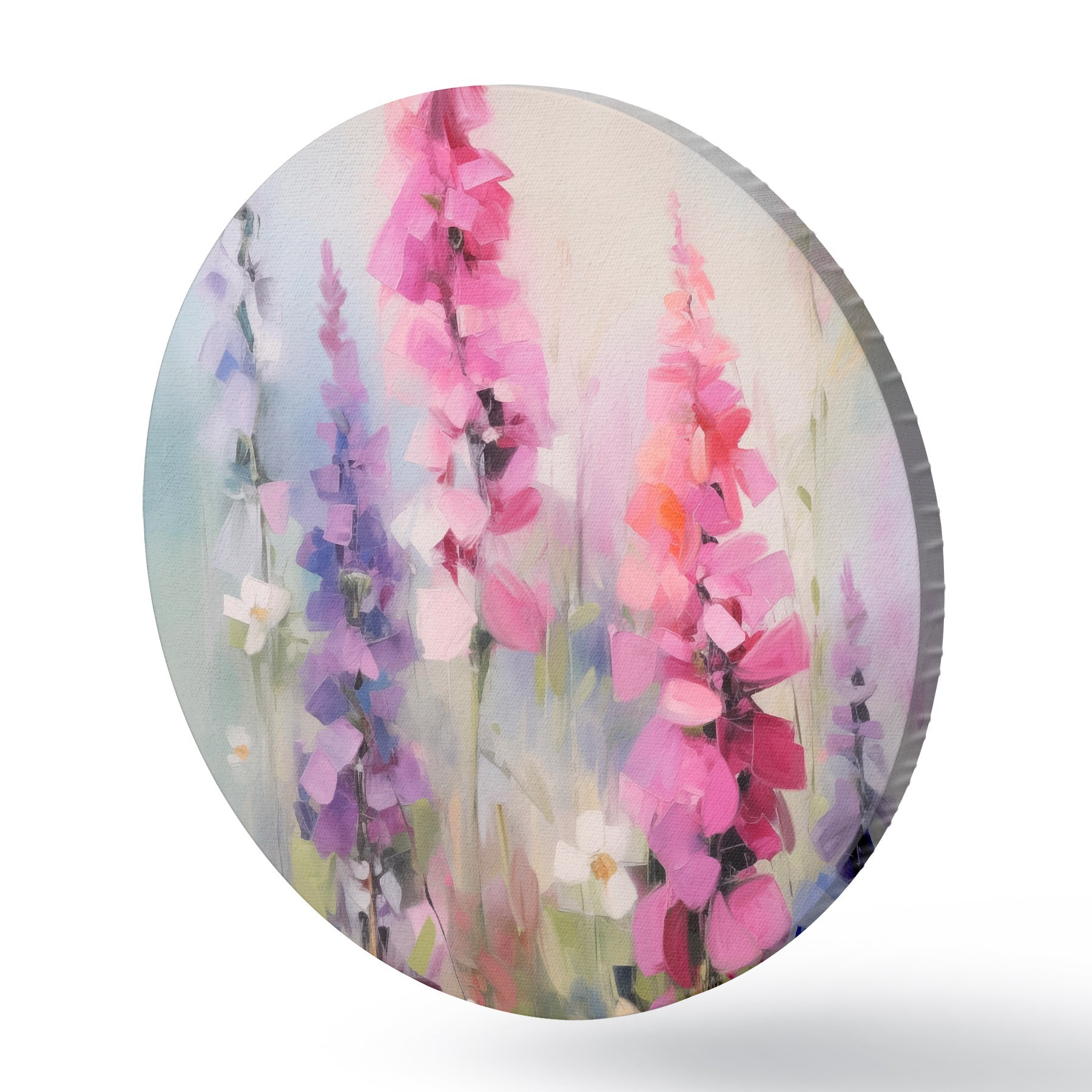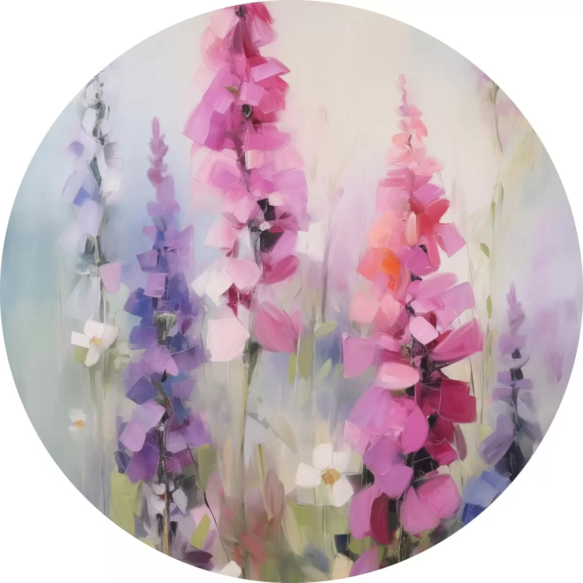 Tableaux rondes Fleurs roses et violettes avec des marguerites blanches dans un champ, coups de pinceau doux, couleurs pastel, style impressionniste Nr r46279