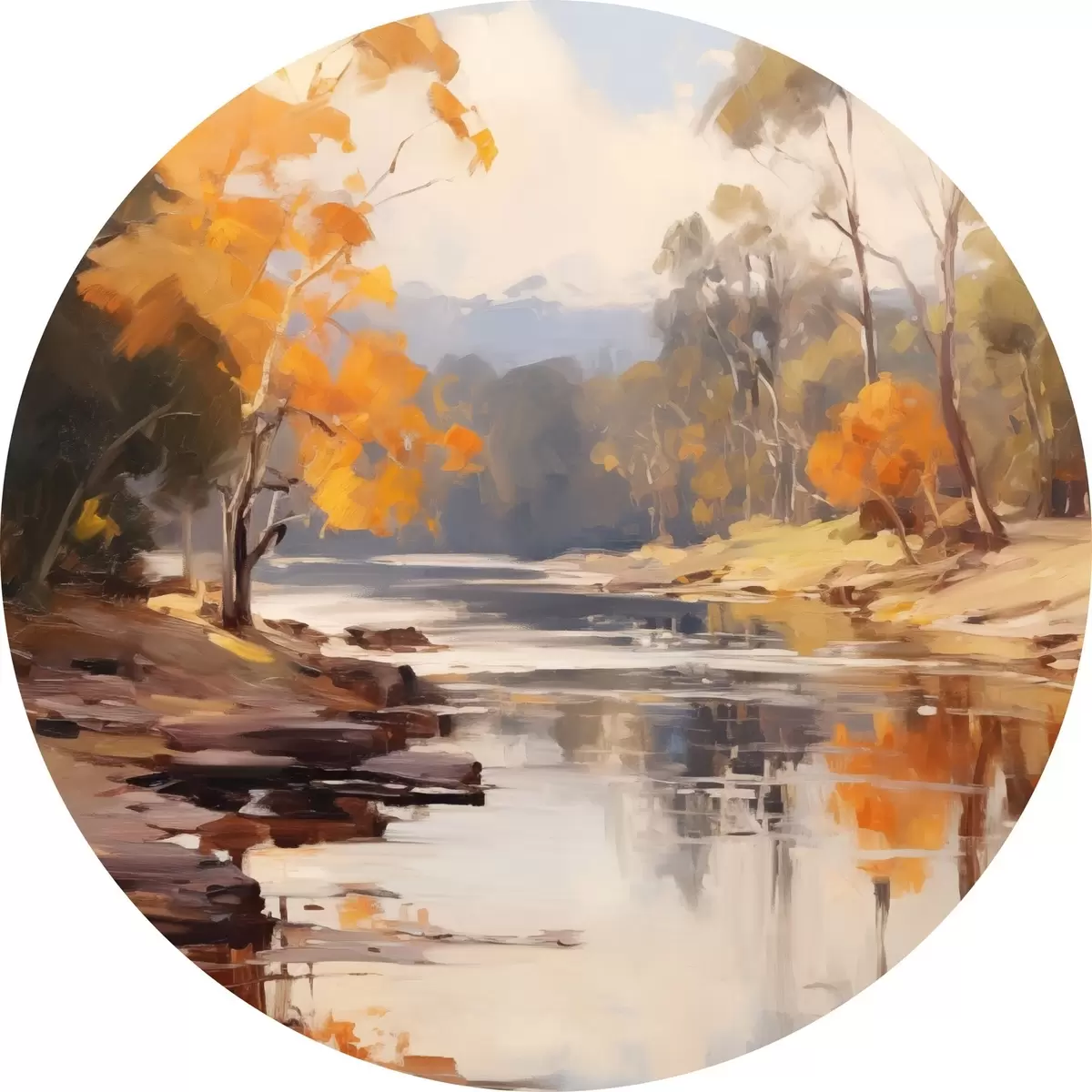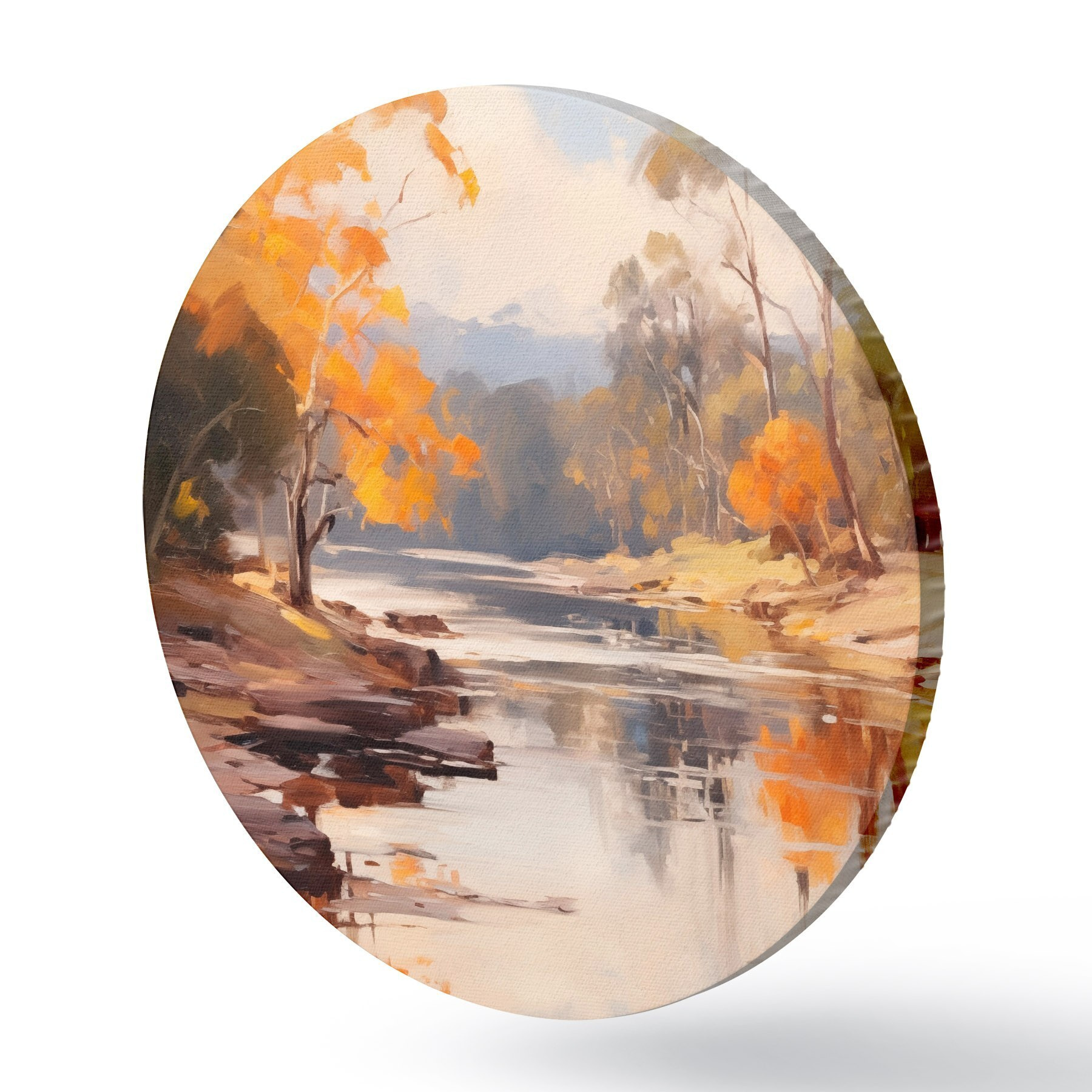 Tableaux rondes Paysage automnal, rivière bordée d'arbres, forêt en arrière-plan, reflets sur l'eau Nr r46280