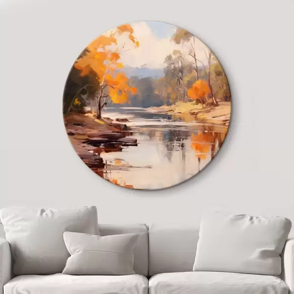 Tableaux rondes Paysage automnal, rivière bordée d'arbres, forêt en arrière-plan, reflets sur l'eau r46280