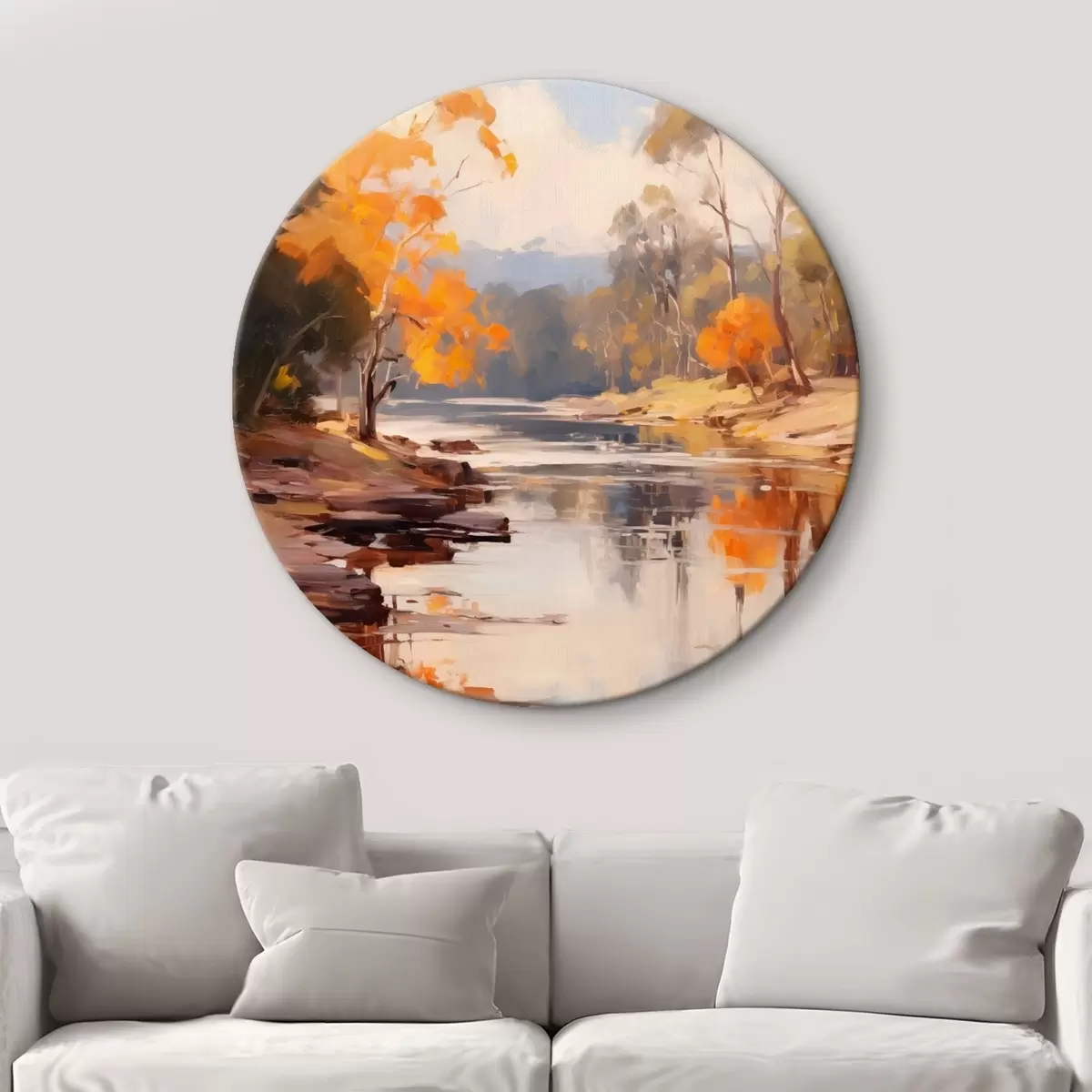 Tableaux rondes Paysage automnal, rivière bordée d'arbres, forêt en arrière-plan, reflets sur l'eau Nr r46280
