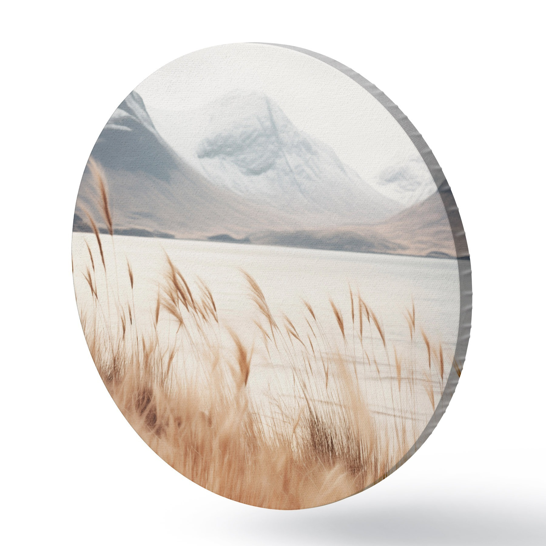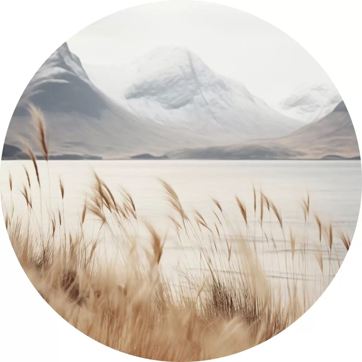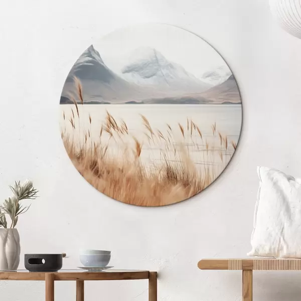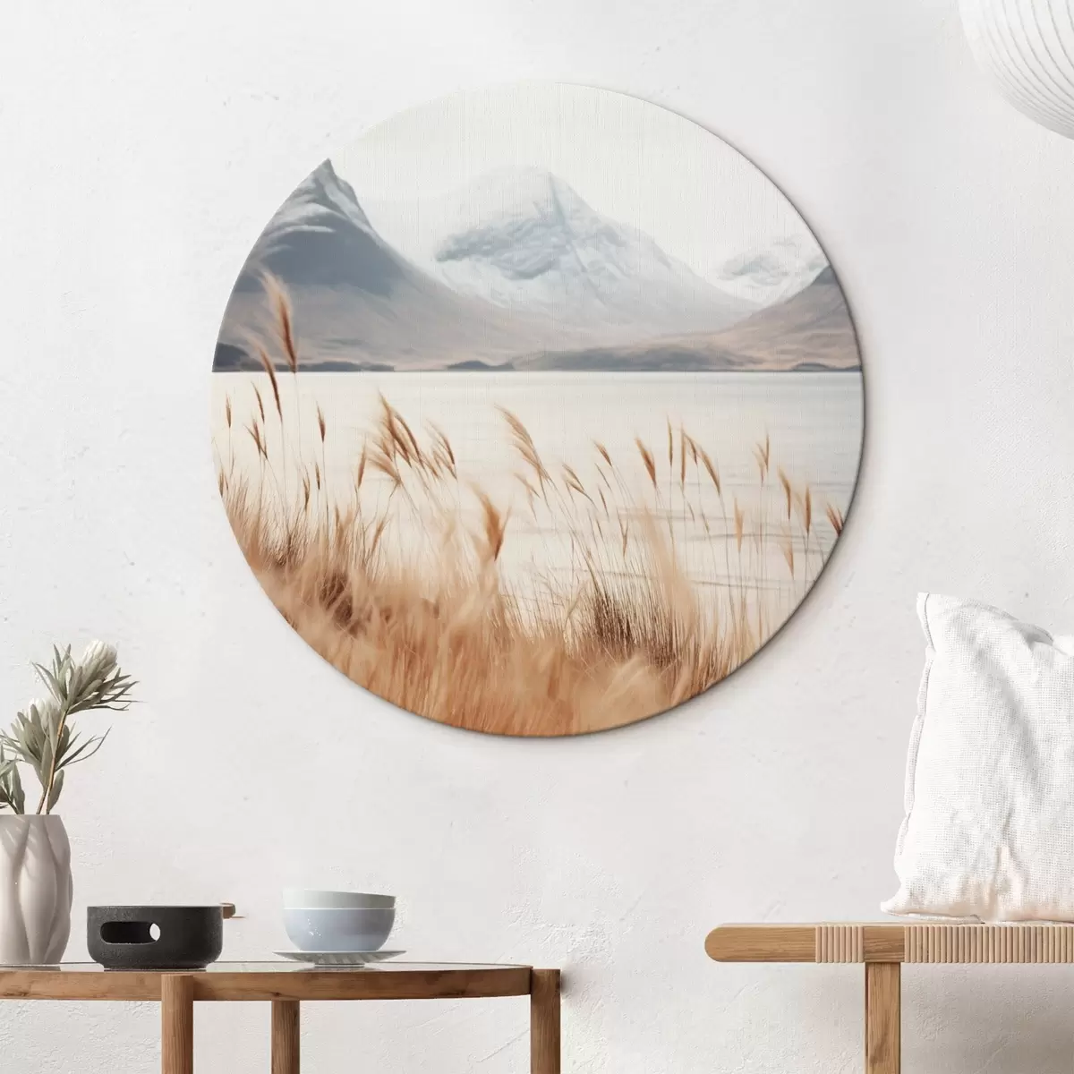 Tableaux rondes Champ d'herbes de la pampa devant un paysage lacustre avec des montagnes enneigées en arrière-plan, lumière douce r46282
