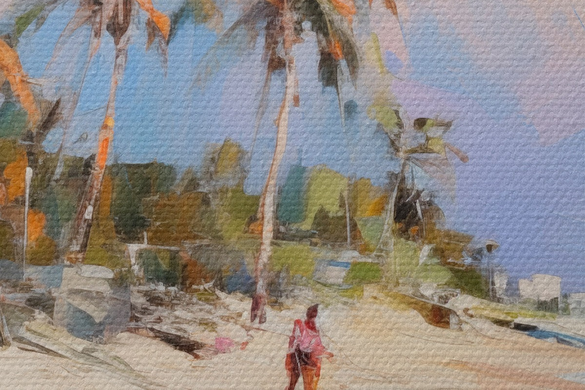 Tableaux rondes Paysage abstrait, une plage avec des palmiers, une journée ensoleillée avec un ciel bleu et quelques nuages r46284