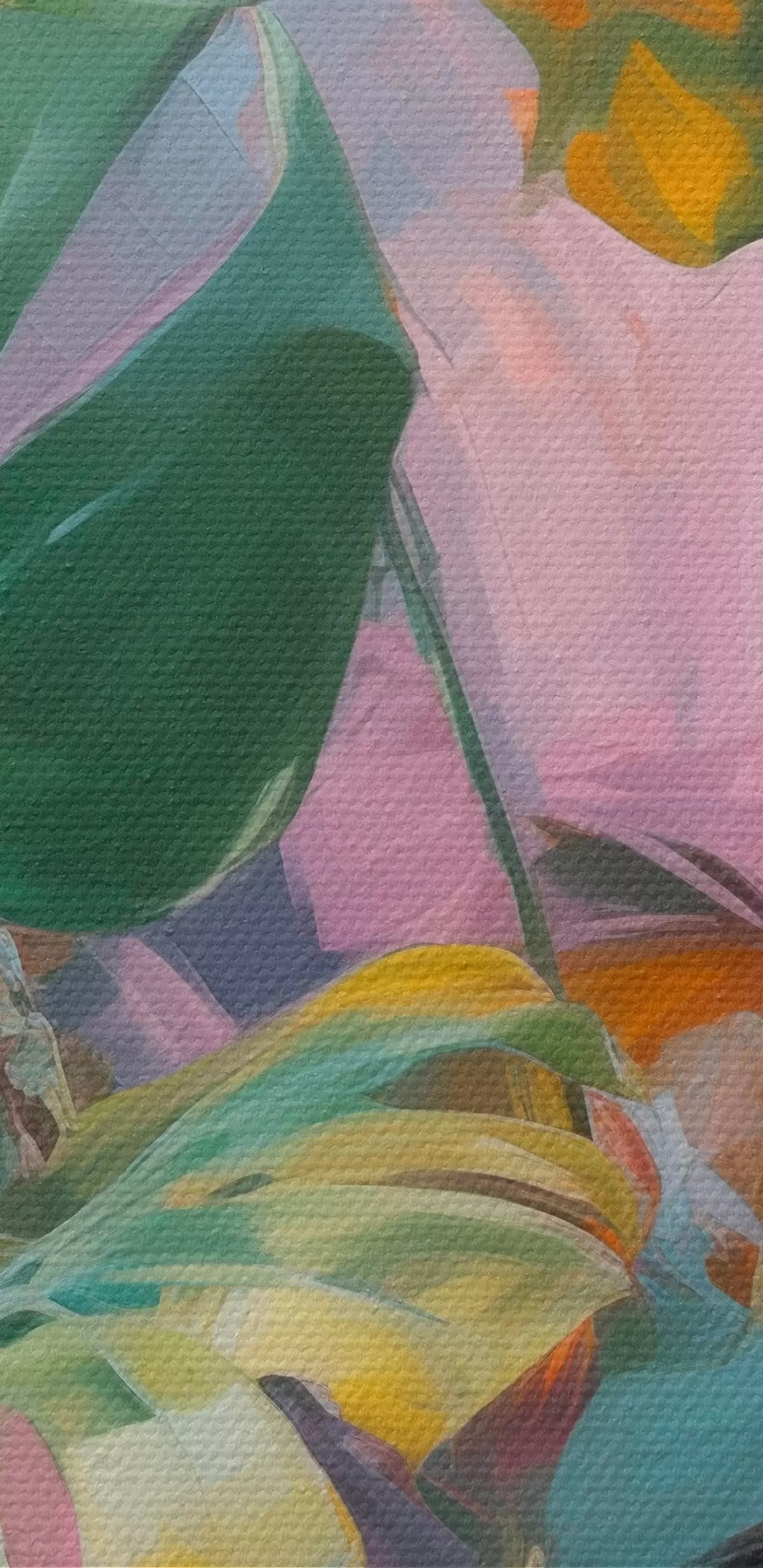 Tableaux rondes Plante abstraite monstera aux feuilles d'un vert éclatant, sur fond de douces teintes roses et violettes Nr r46286