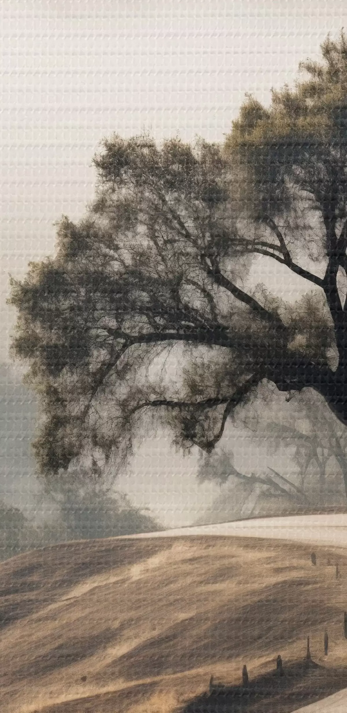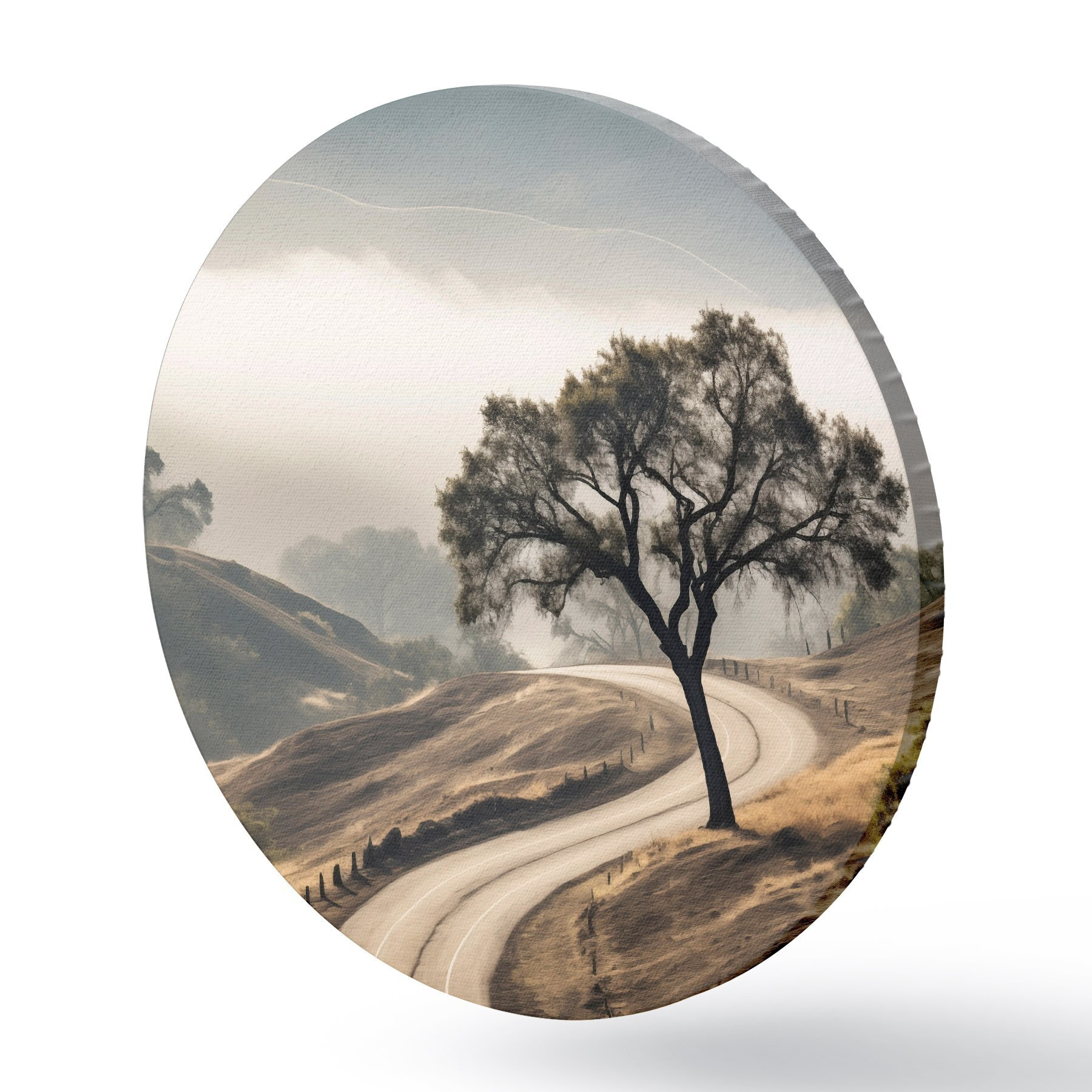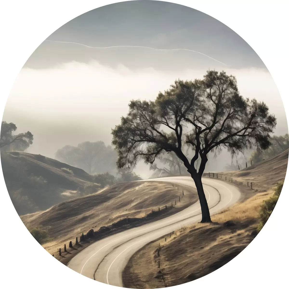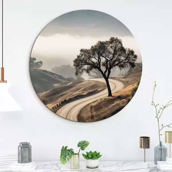 Tableaux rondes Une route sinueuse à travers des collines vallonnées avec un arbre au premier plan, le fond avec du brouillard et des montagnes Nr r46288