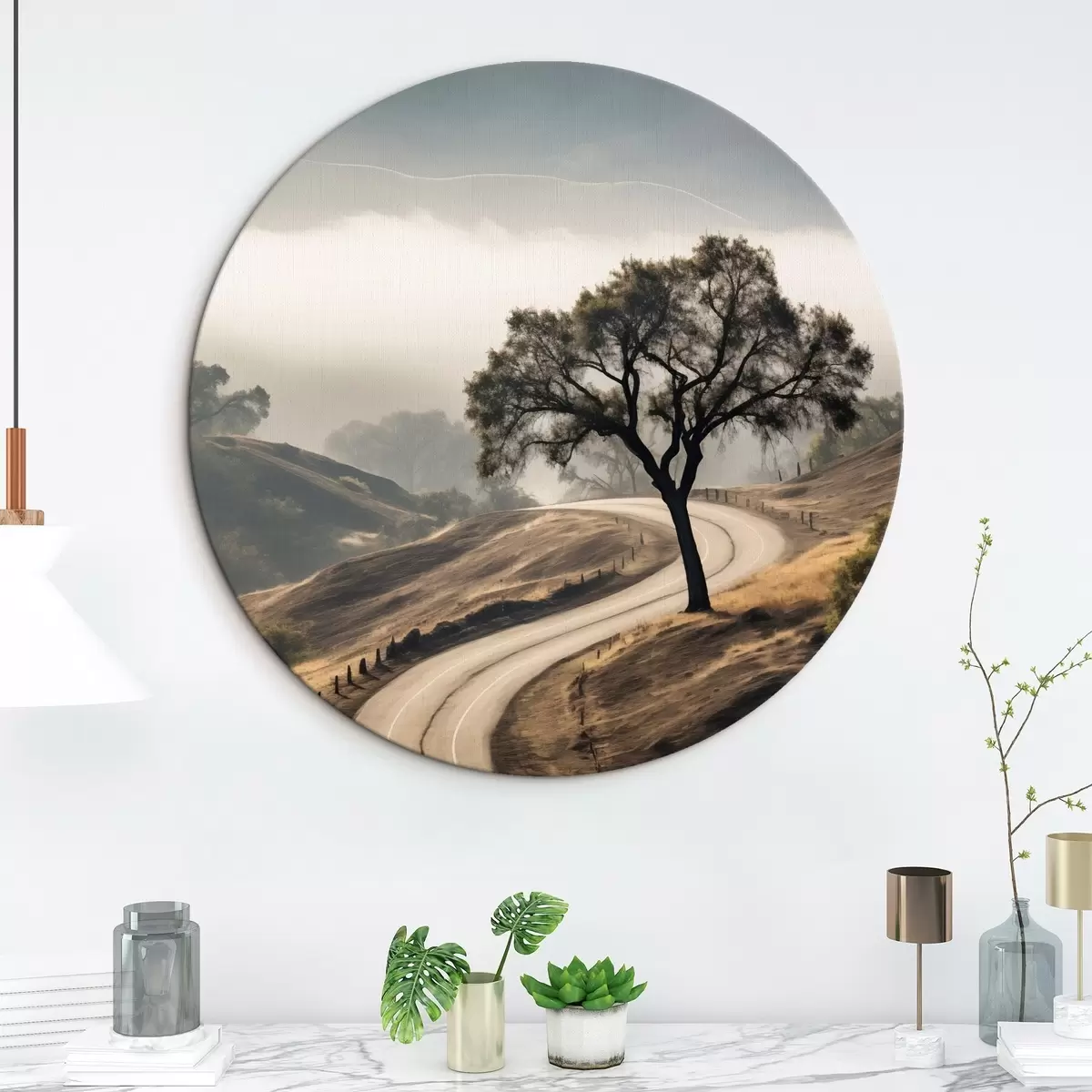 Tableaux rondes Une route sinueuse à travers des collines vallonnées avec un arbre au premier plan, le fond avec du brouillard et des montagnes r46288