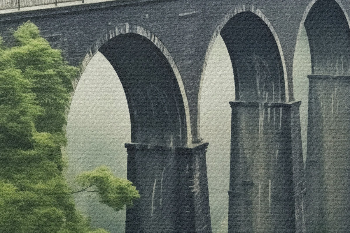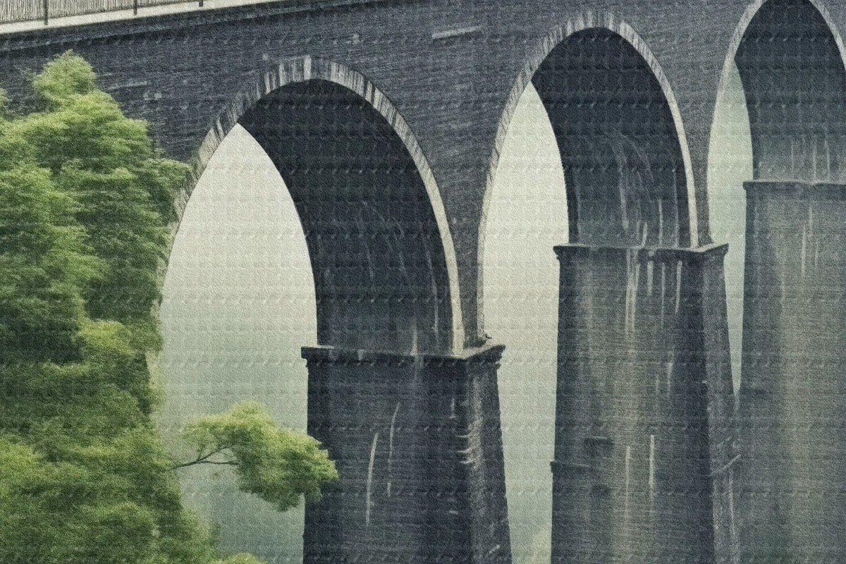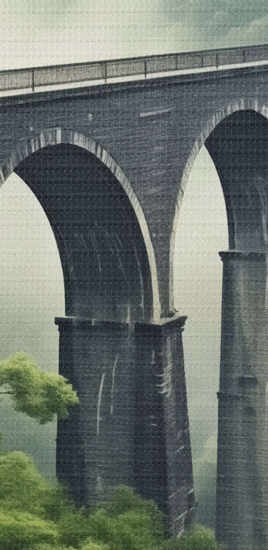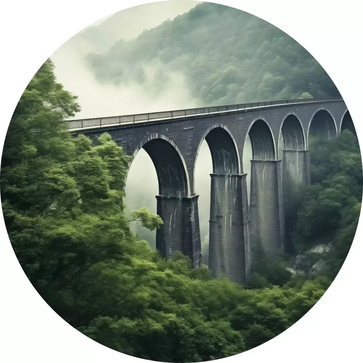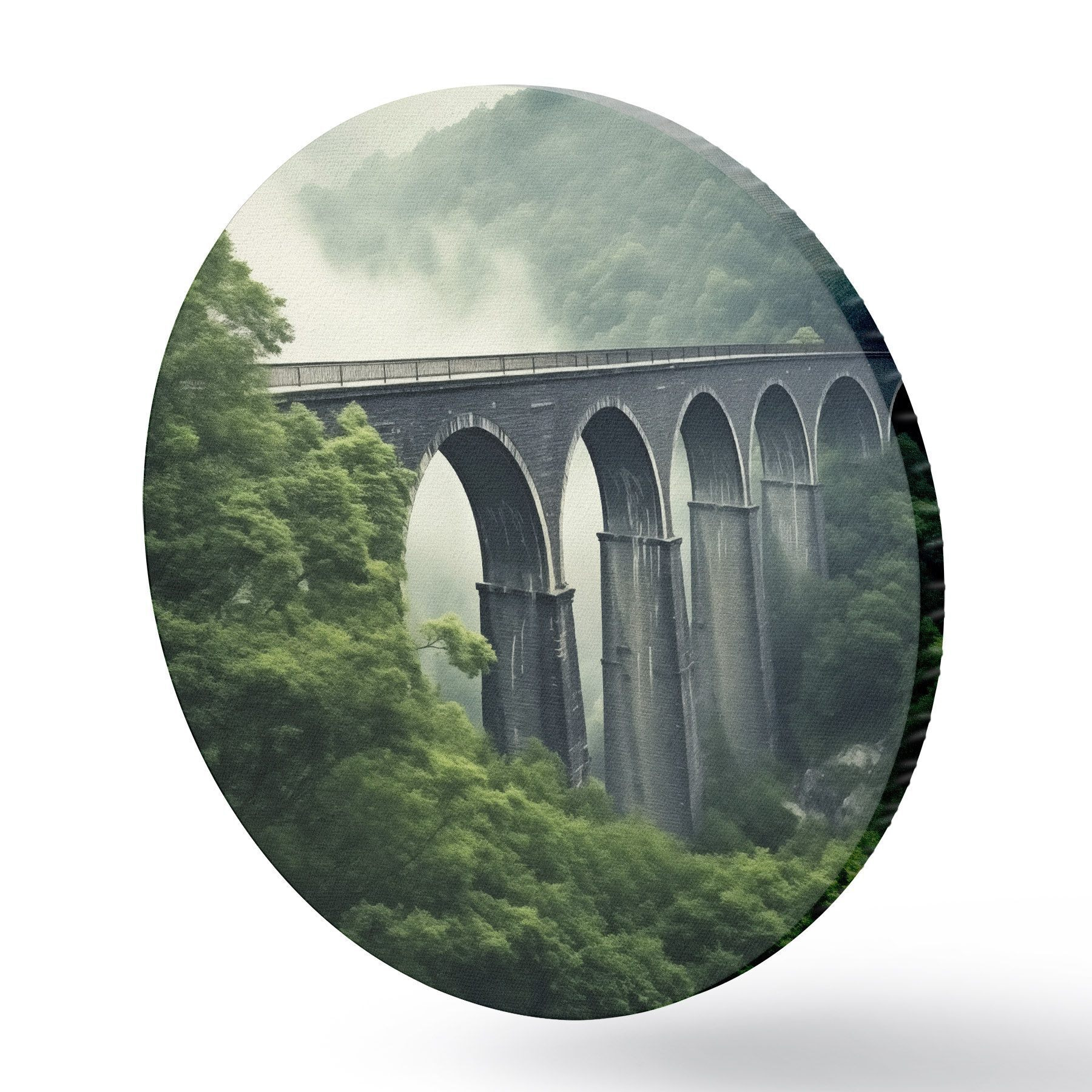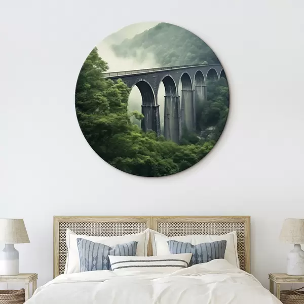 Tableaux rondes Viaduc en pierre au-dessus d'une vallée boisée brumeuse Nr r46483