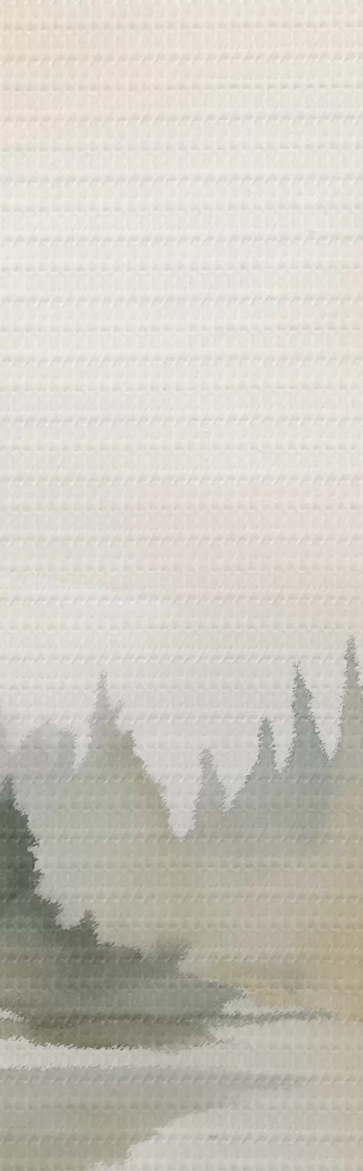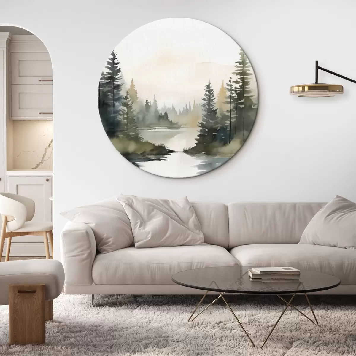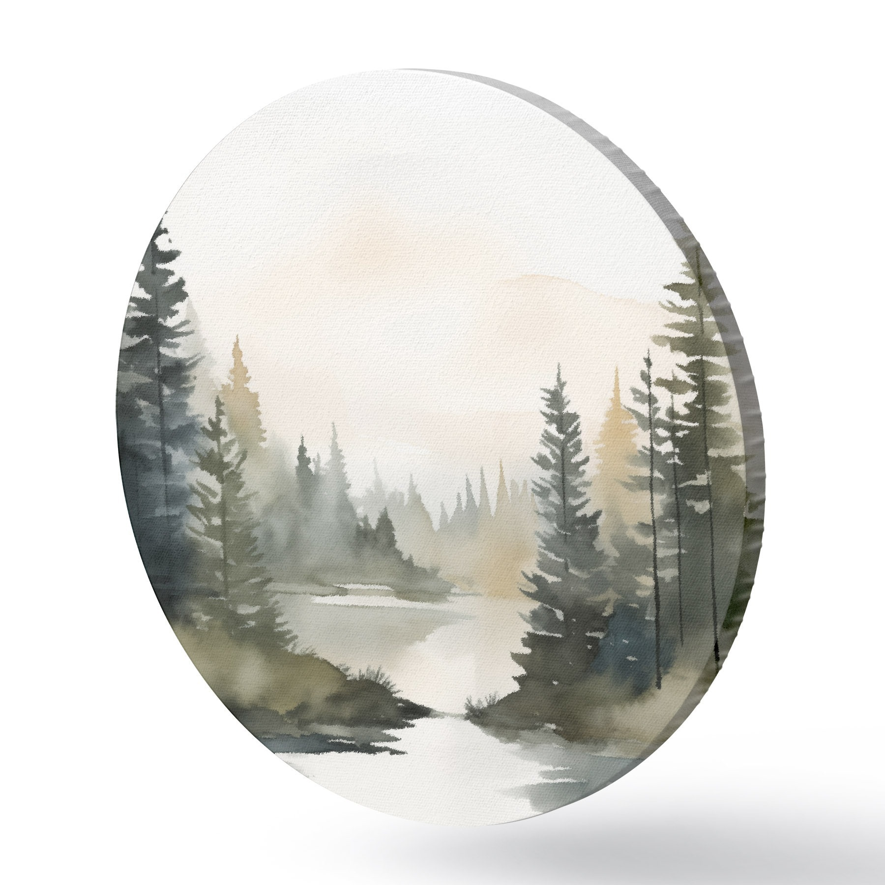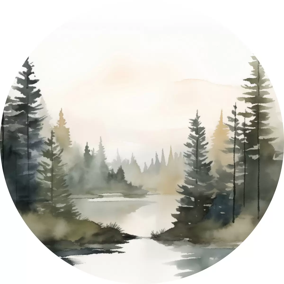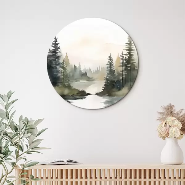 Tableaux rondes Forêt brumeuse de conifères au-dessus d'une rivière calme, style aquarelle Nr r46507