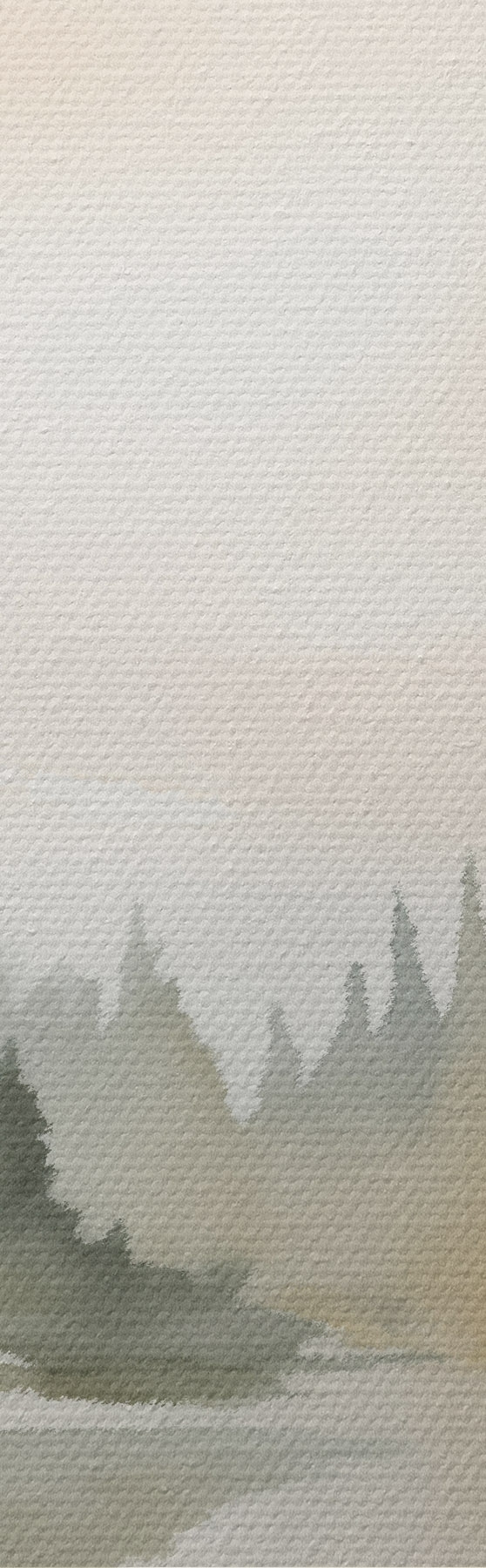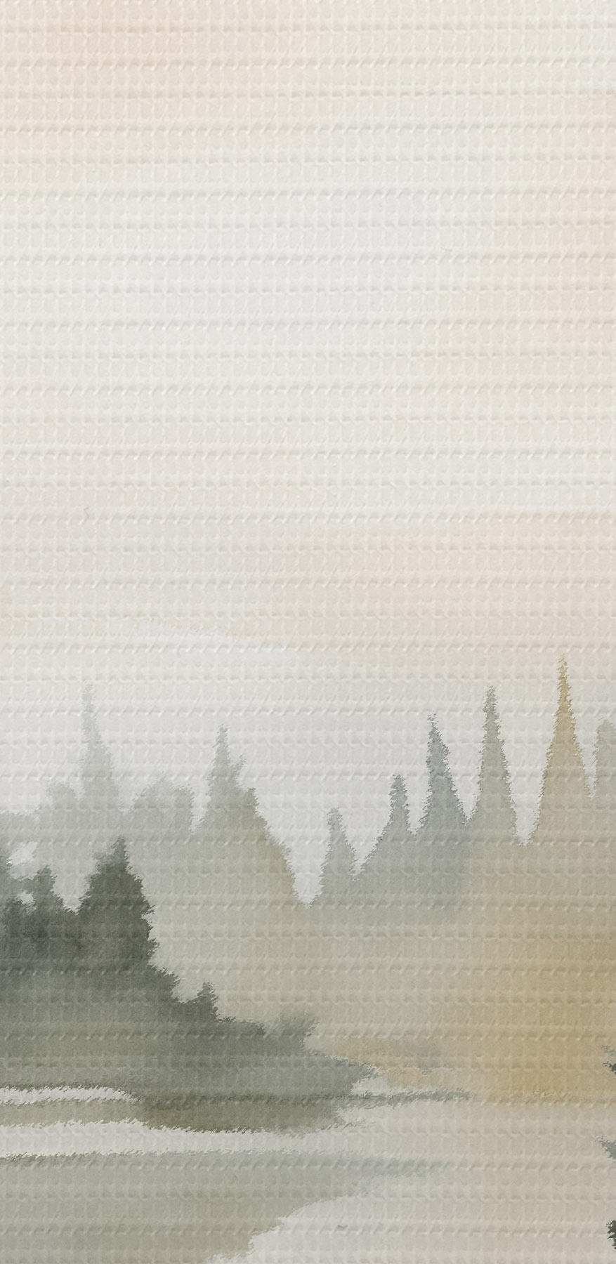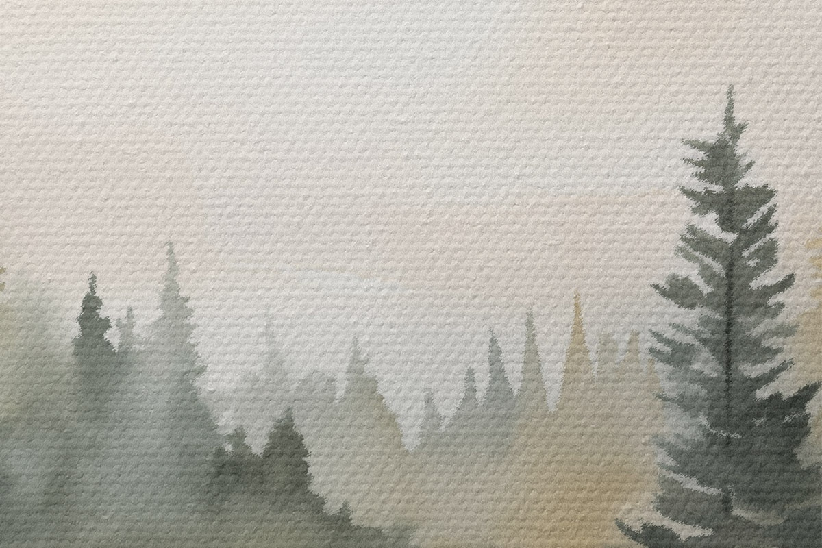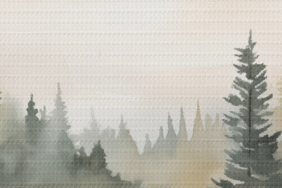 Tableaux rondes Forêt brumeuse de conifères au-dessus d'une rivière calme, style aquarelle r46507
