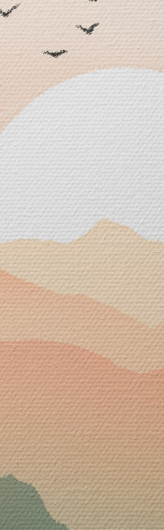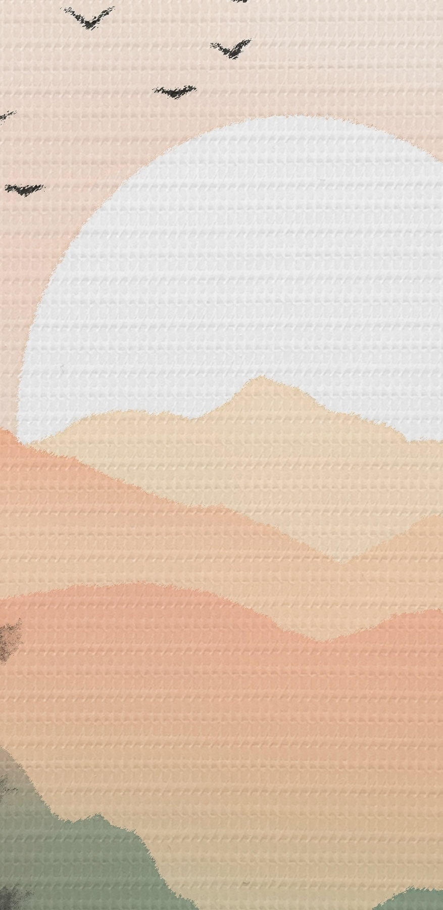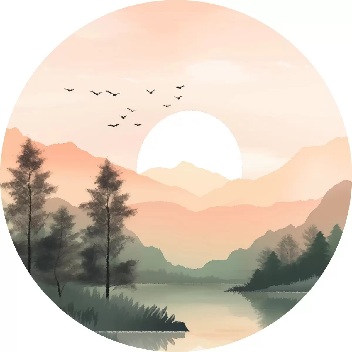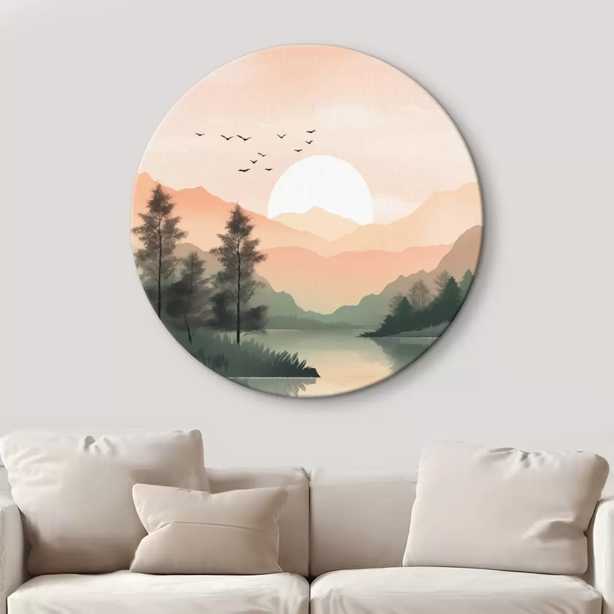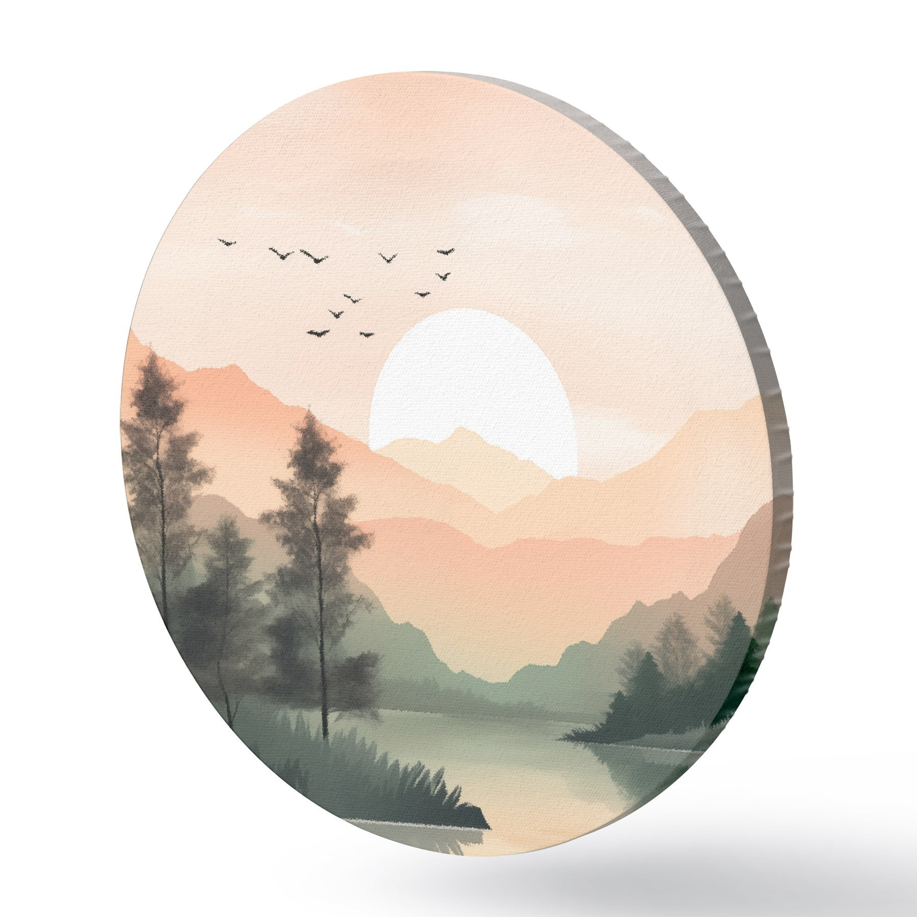 Tableaux rondes Coucher de soleil pastel sur un lac tranquille avec des collines lointaines et des oiseaux Nr r46508