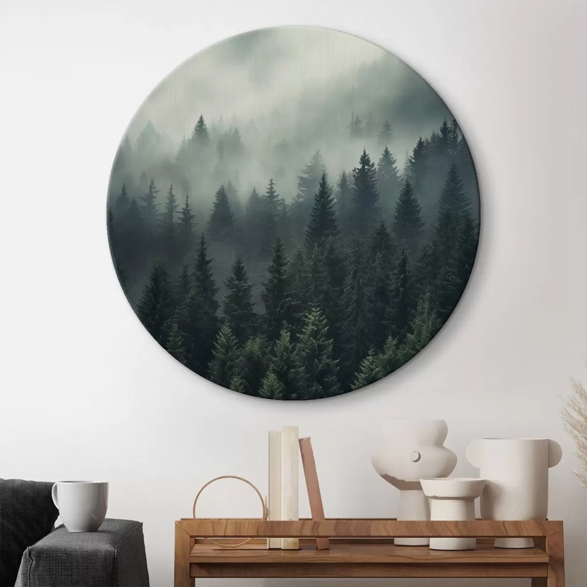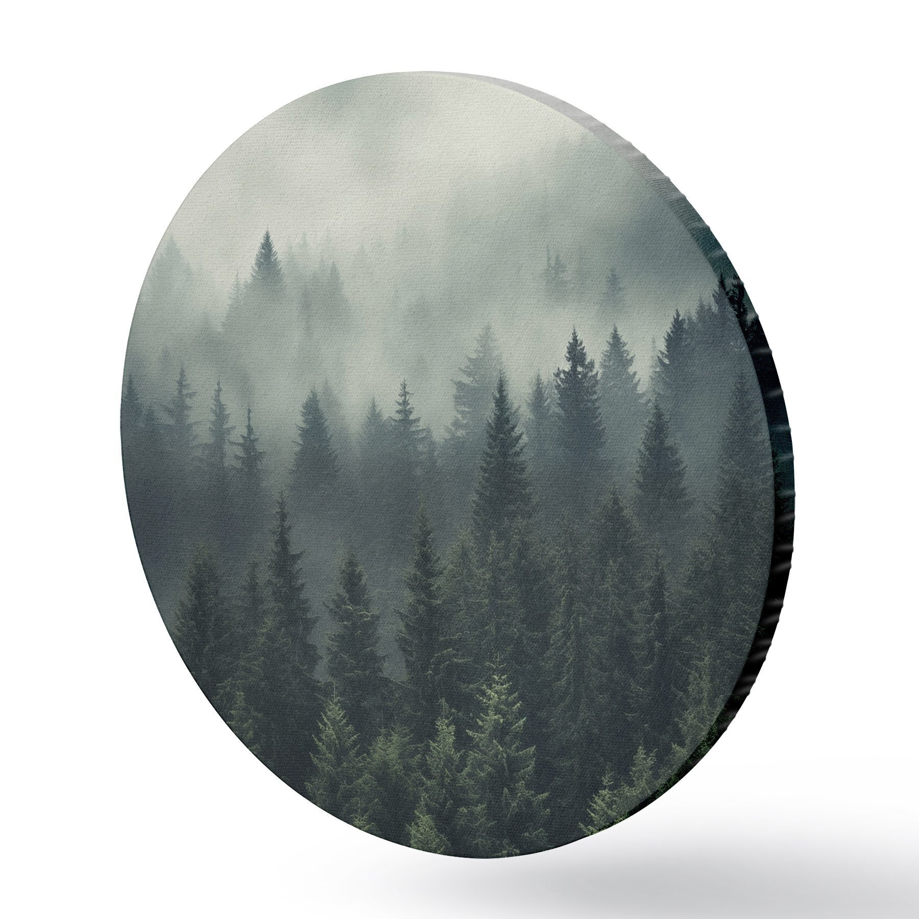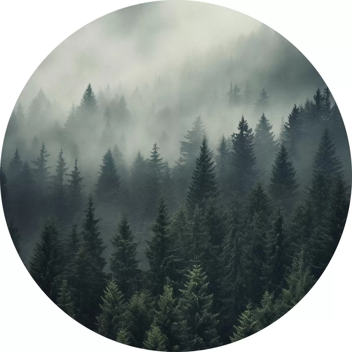 Tableaux rondes Brouillard roulant sur une forêt dense à feuilles persistantes Nr r46512