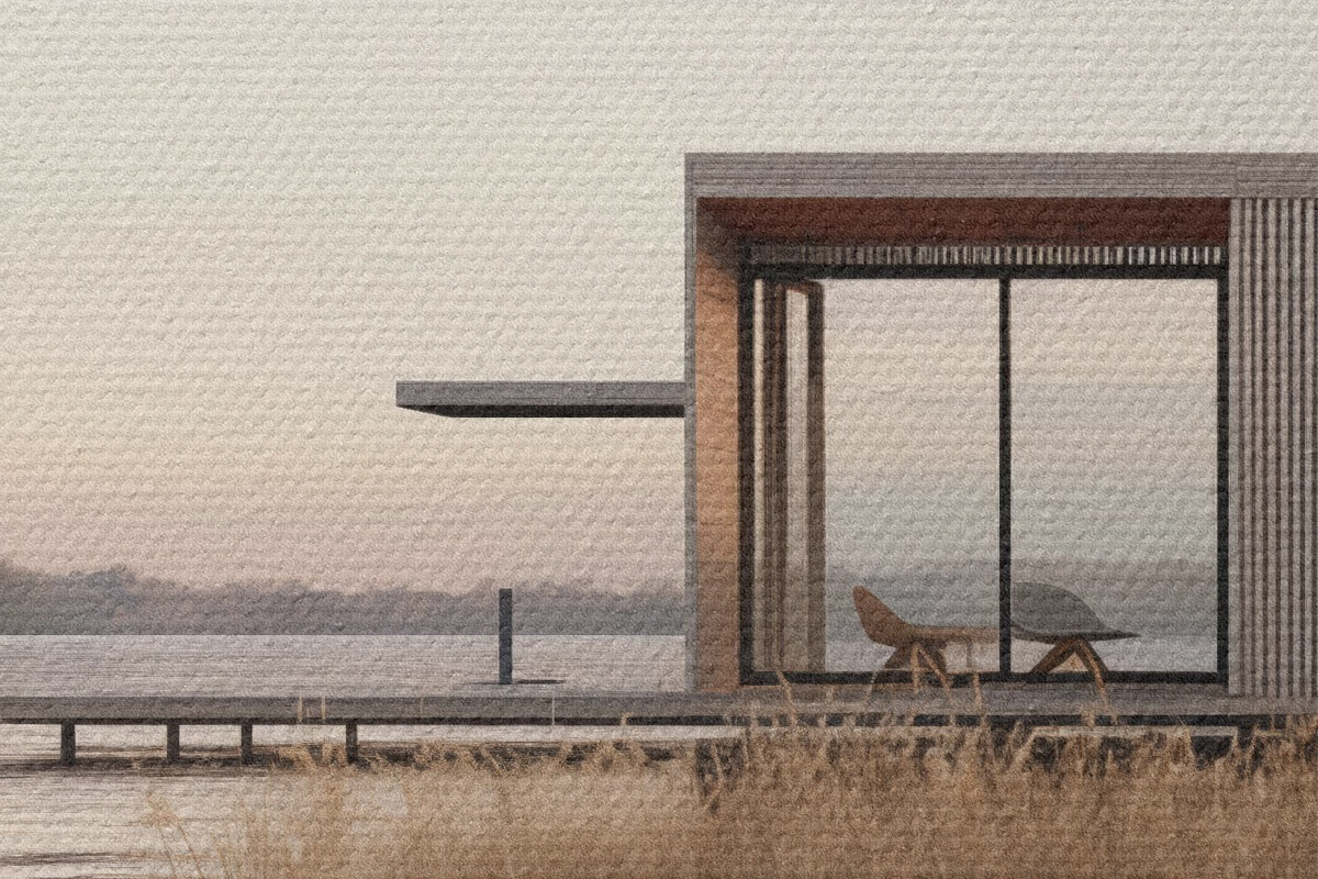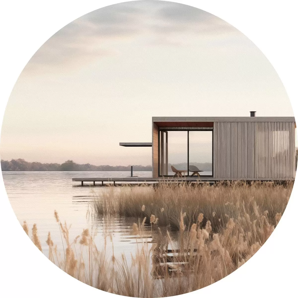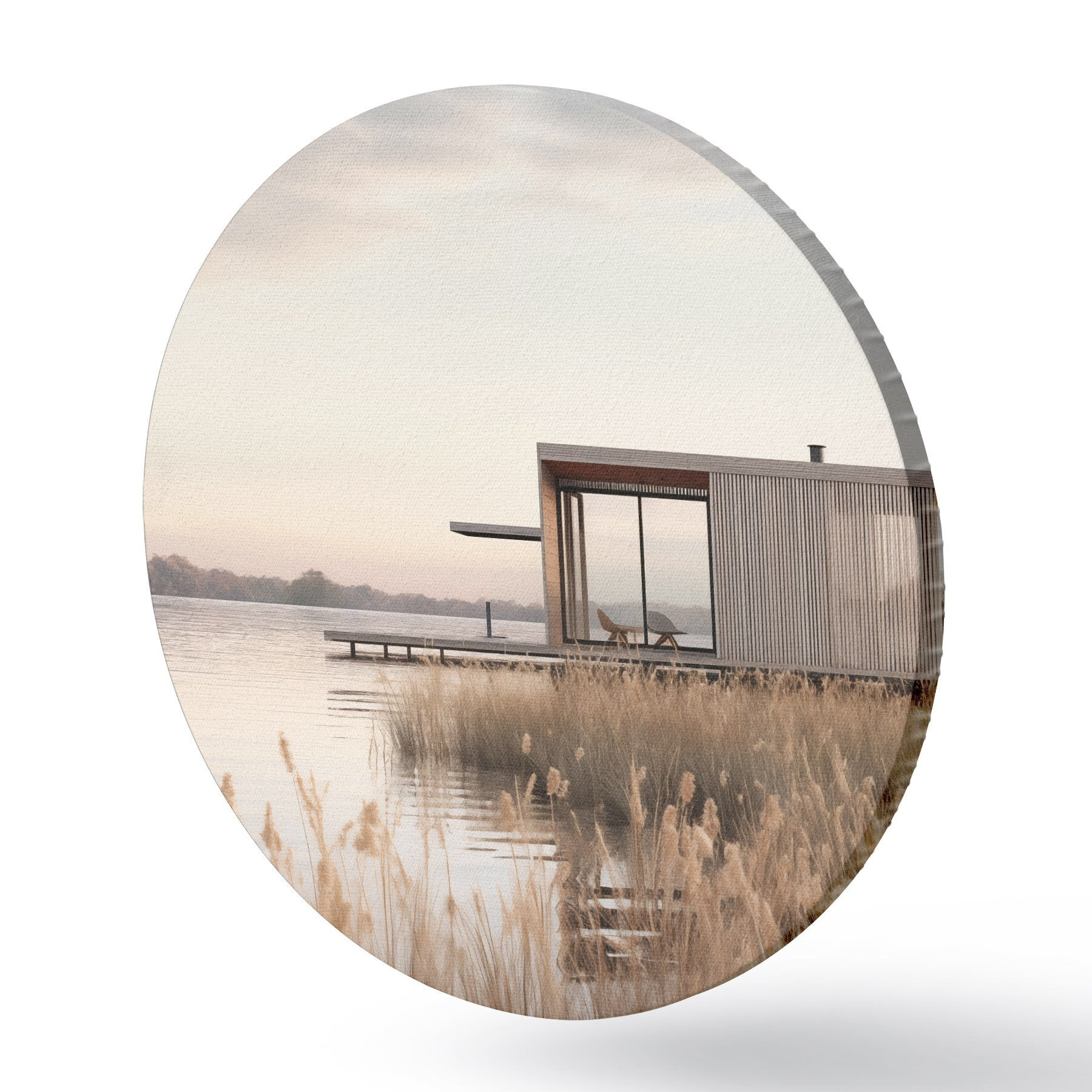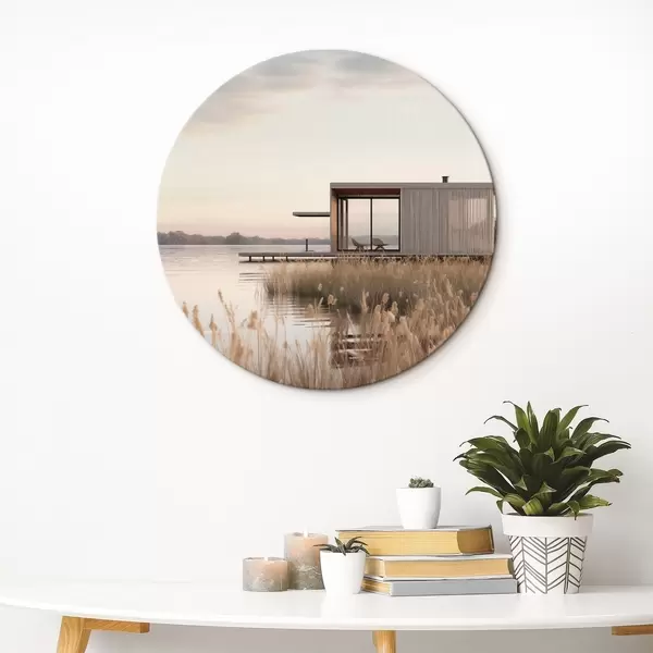 Tableaux rondes Cabane moderne au bord d'un lac, parmi les roseaux, au crépuscule Nr r46513