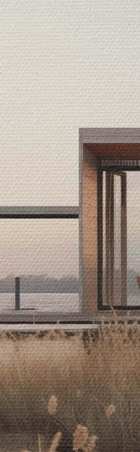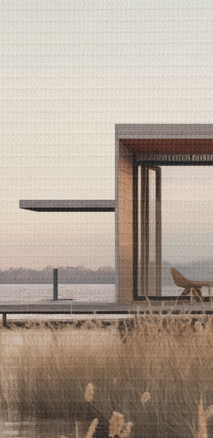 Tableaux rondes Cabane moderne au bord d'un lac, parmi les roseaux, au crépuscule r46513