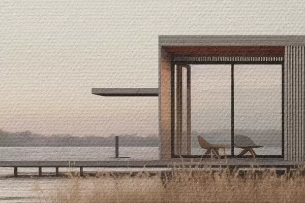 Tableaux rondes Cabane moderne au bord d'un lac, parmi les roseaux, au crépuscule r46513
