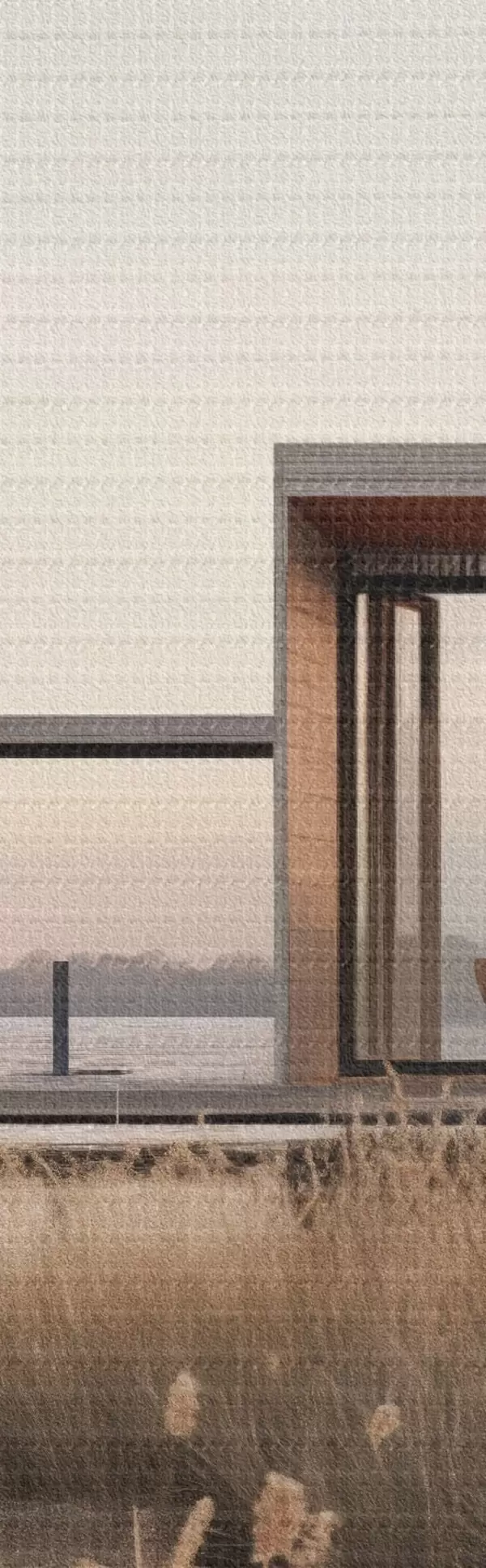 Tableaux rondes Cabane moderne au bord d'un lac, parmi les roseaux, au crépuscule Nr r46513
