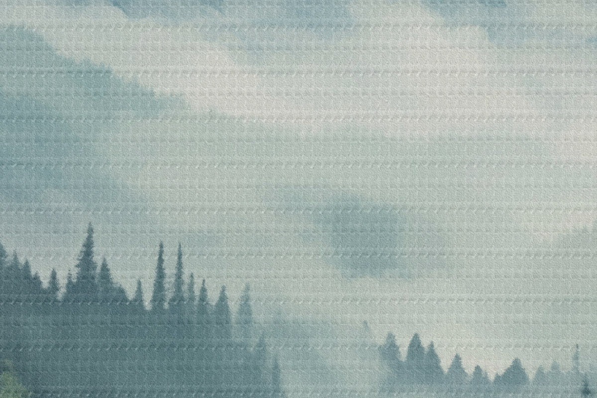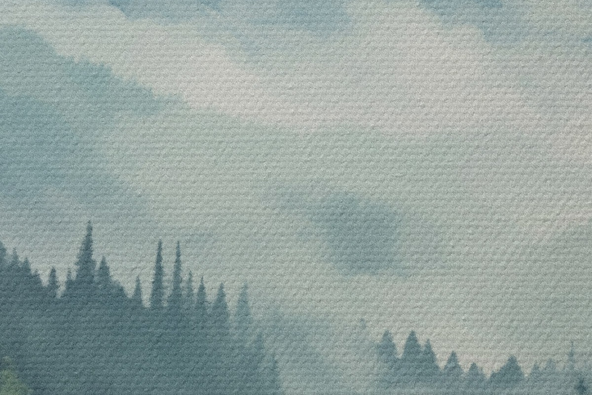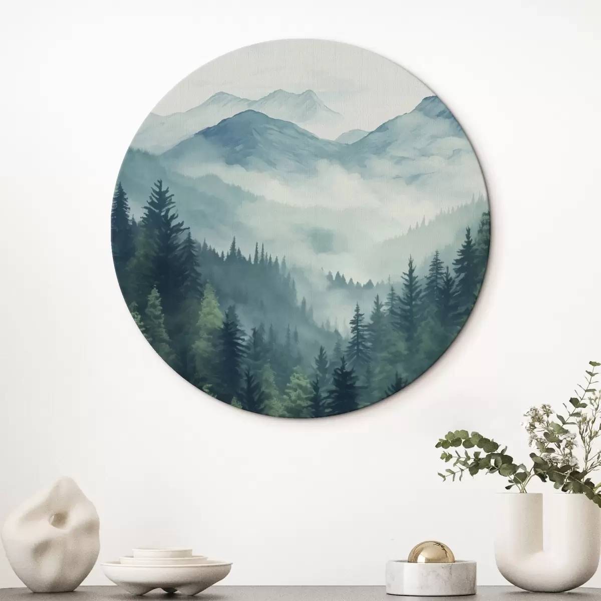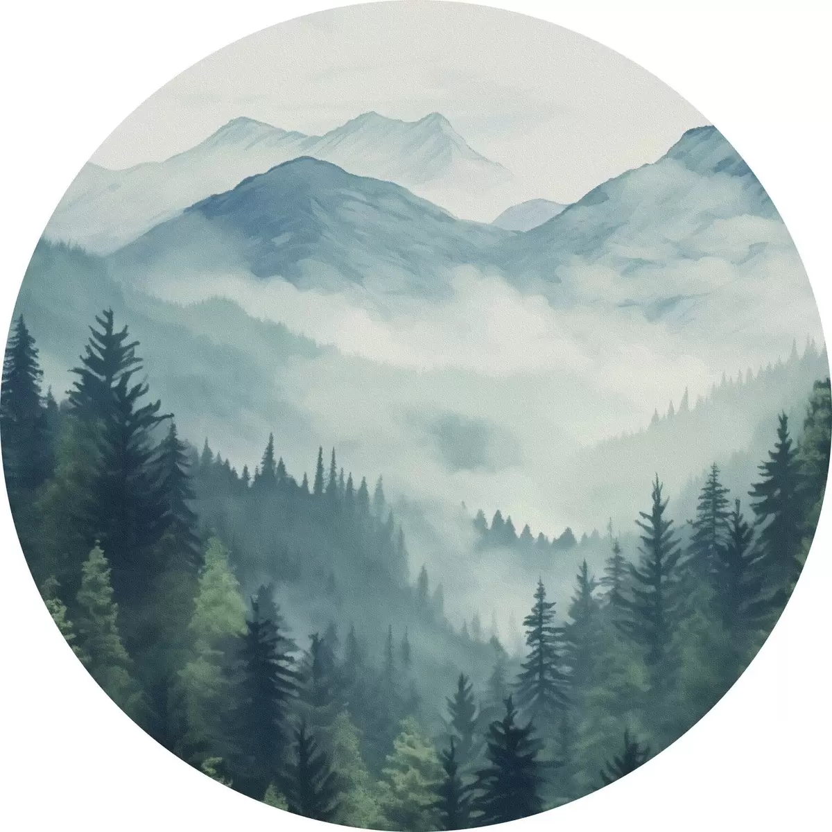 Tableaux rondes Montagnes et forêt aquarellées dans la douce brume matinale r46519