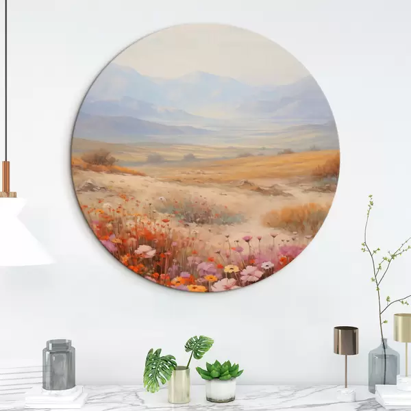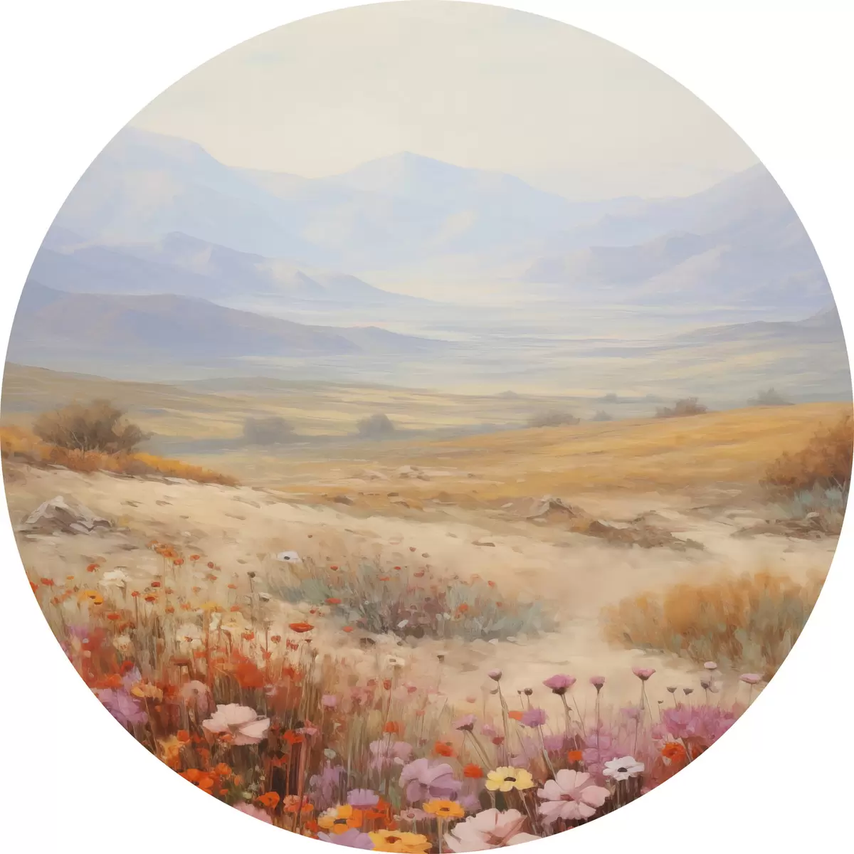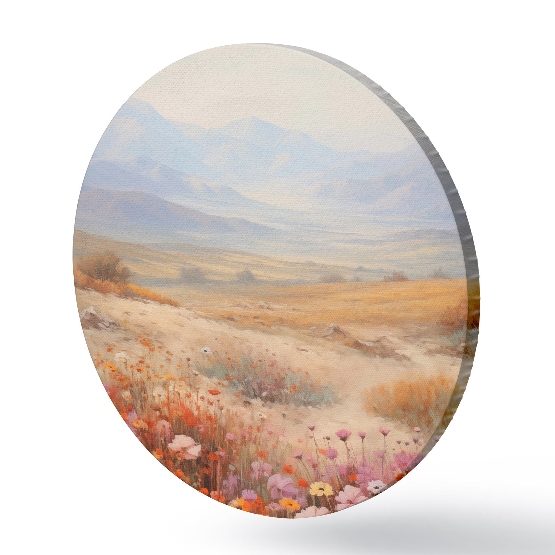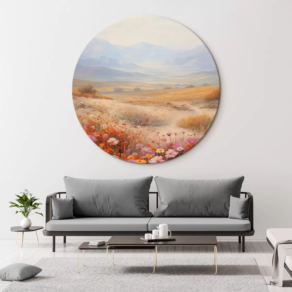 Tableaux rondes Paysage, champ de fleurs colorées avec des montagnes en arrière-plan, couleurs douces et pastel Nr r46685