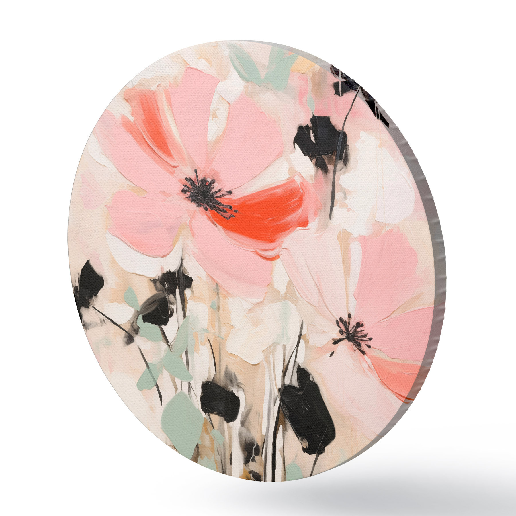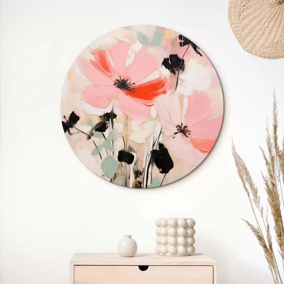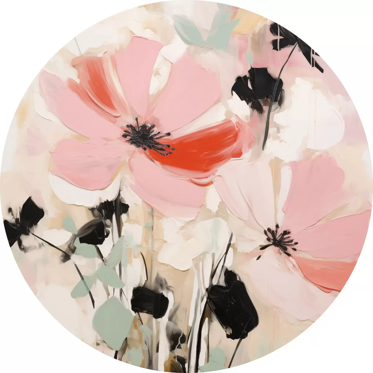 Tableaux rondes Fleurs roses et noires avec des feuilles, couleurs pastel douces, composition florale abstraite, art minimaliste Nr r46687