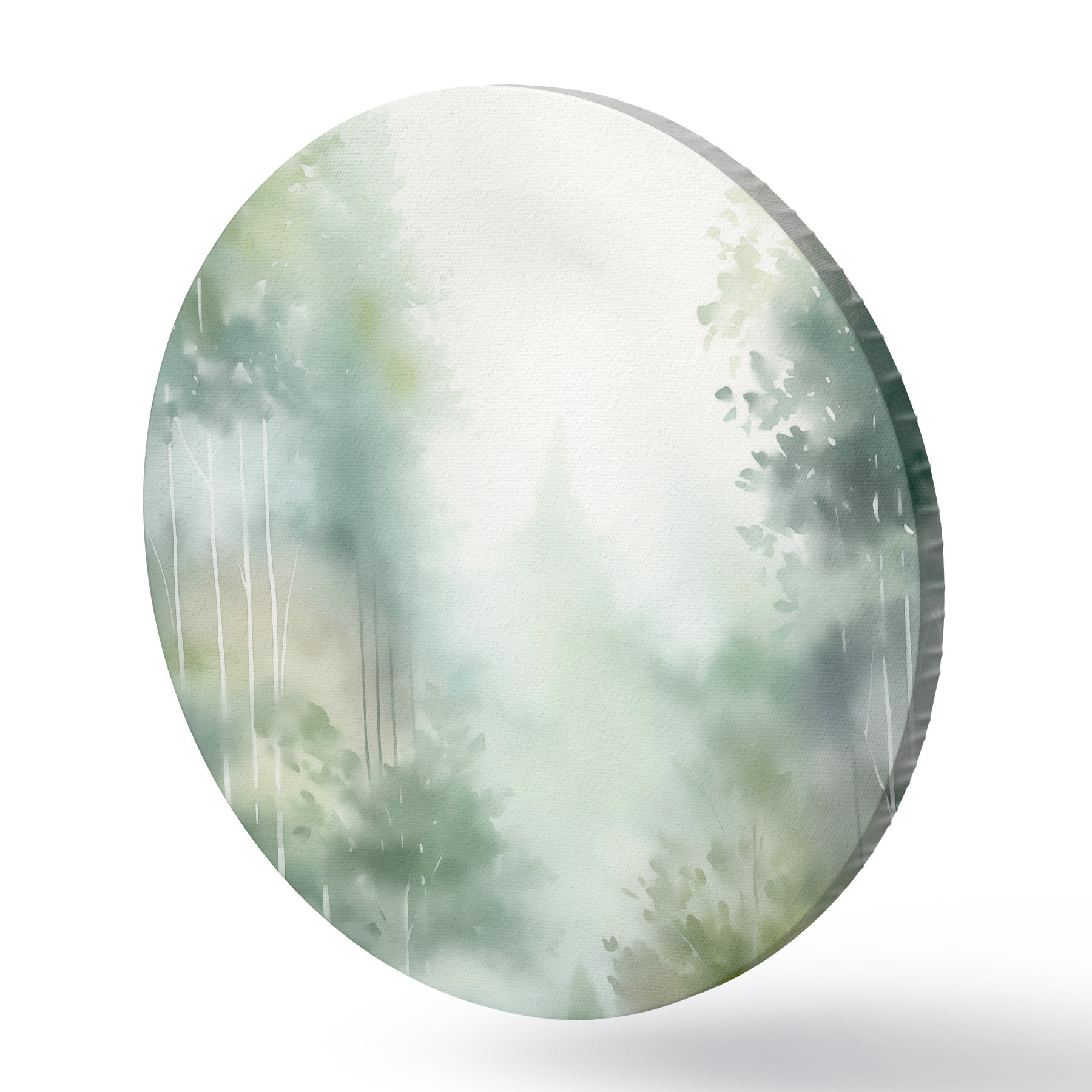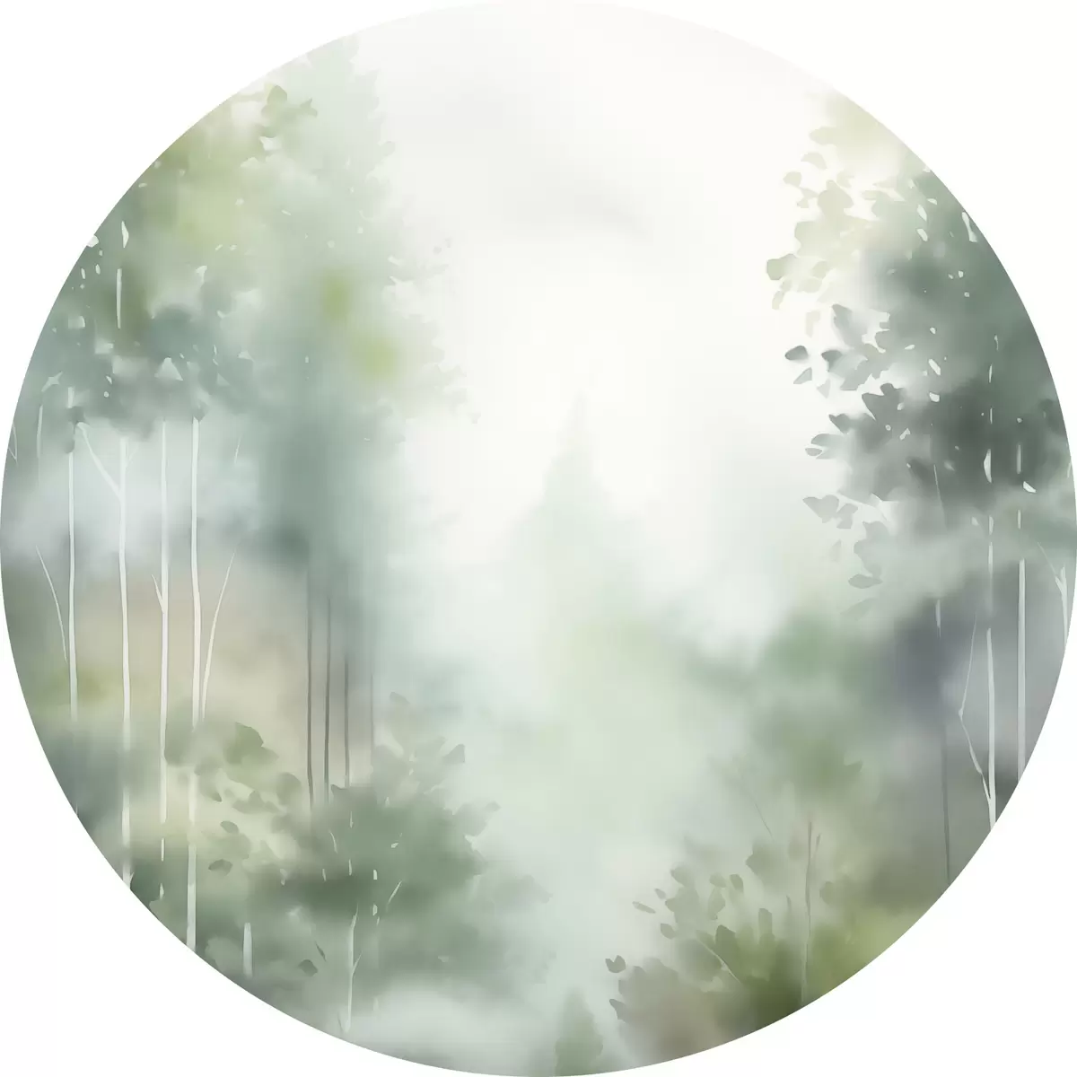 Tableaux rondes Aquarelle représentant une forêt abstraite avec de grands arbres et un feuillage vert, dans des tons doux et discrets. r46689