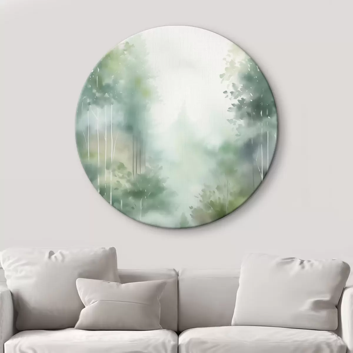 Tableaux rondes Aquarelle représentant une forêt abstraite avec de grands arbres et un feuillage vert, dans des tons doux et discrets. Nr r46689