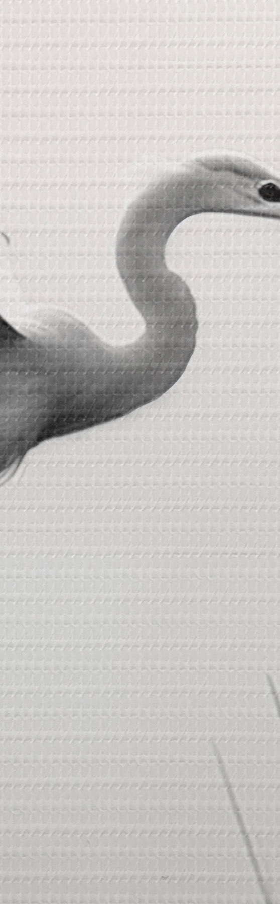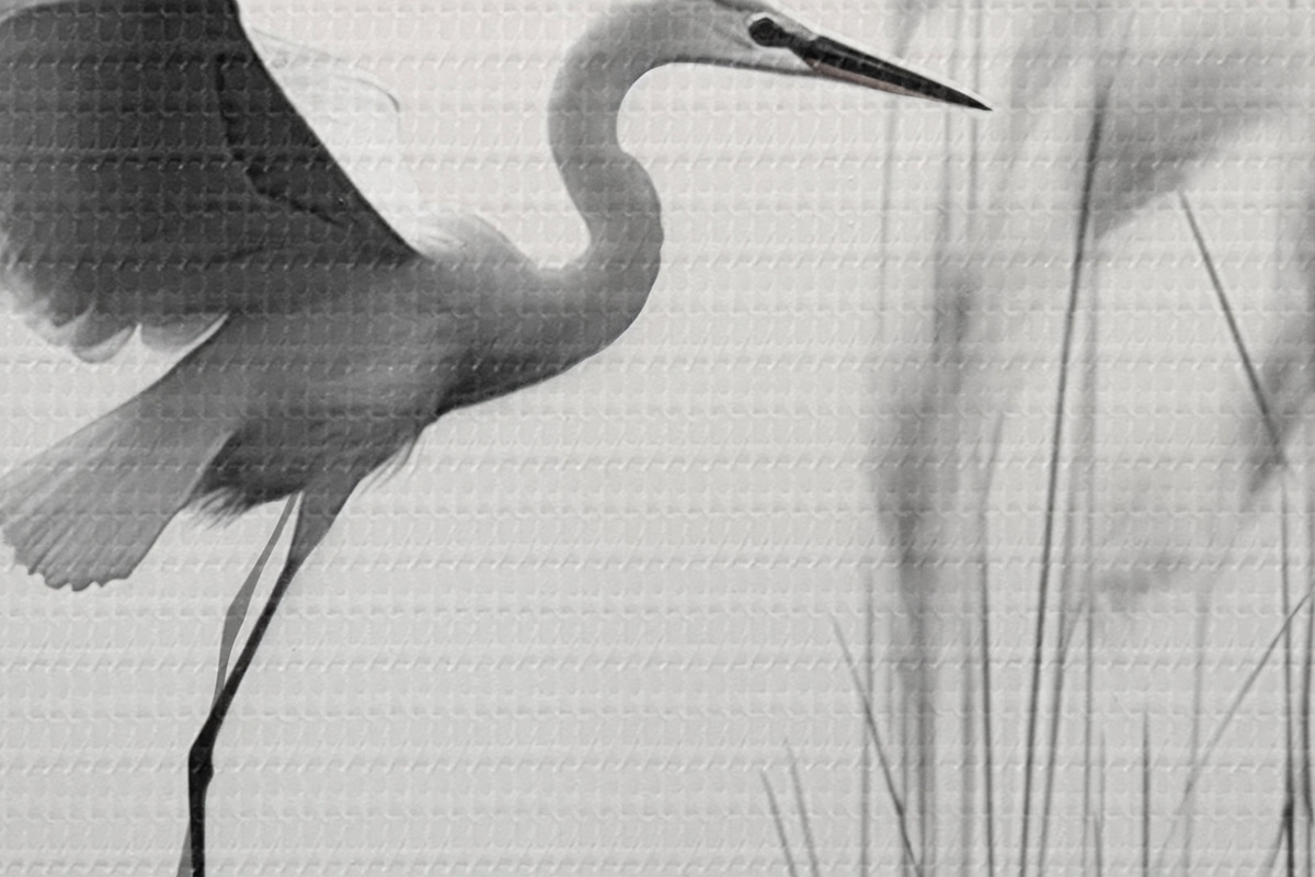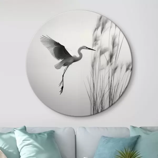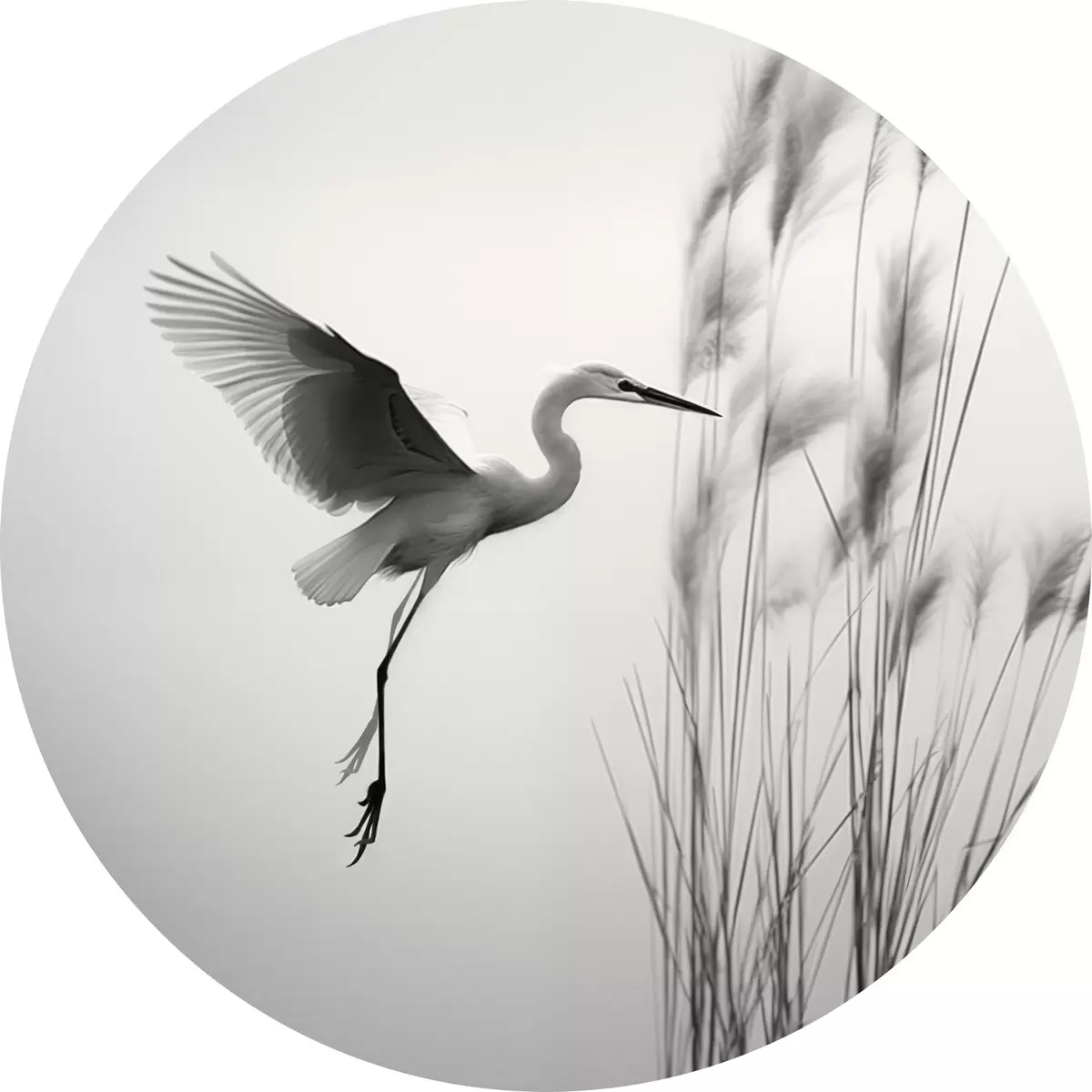 Tableaux rondes Un héron blanc aux ailes déployées, volant près de grands roseaux, composition minimaliste en noir et blanc r46693