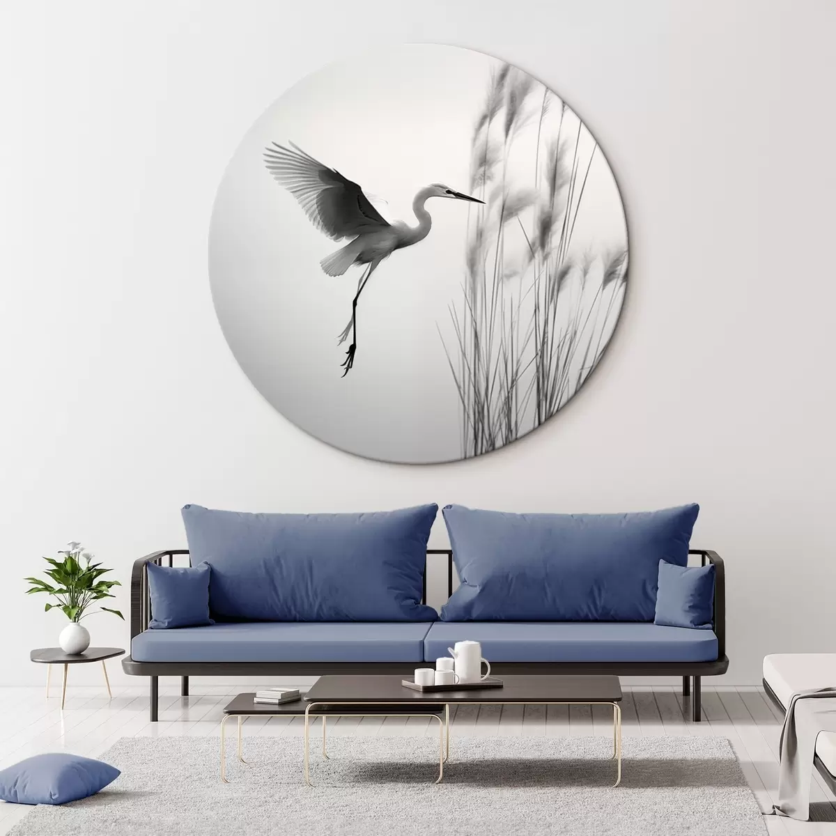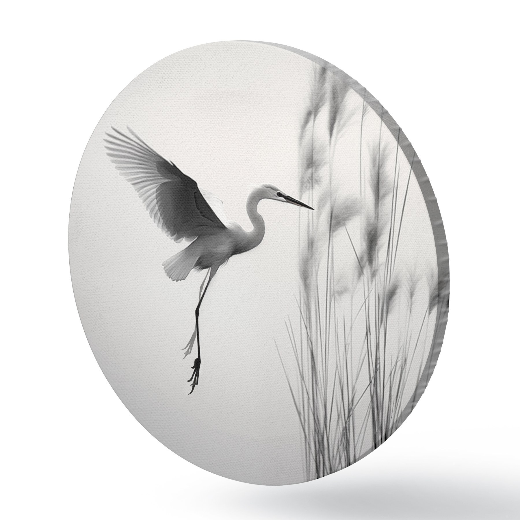 Tableaux rondes Un héron blanc aux ailes déployées, volant près de grands roseaux, composition minimaliste en noir et blanc Nr r46693