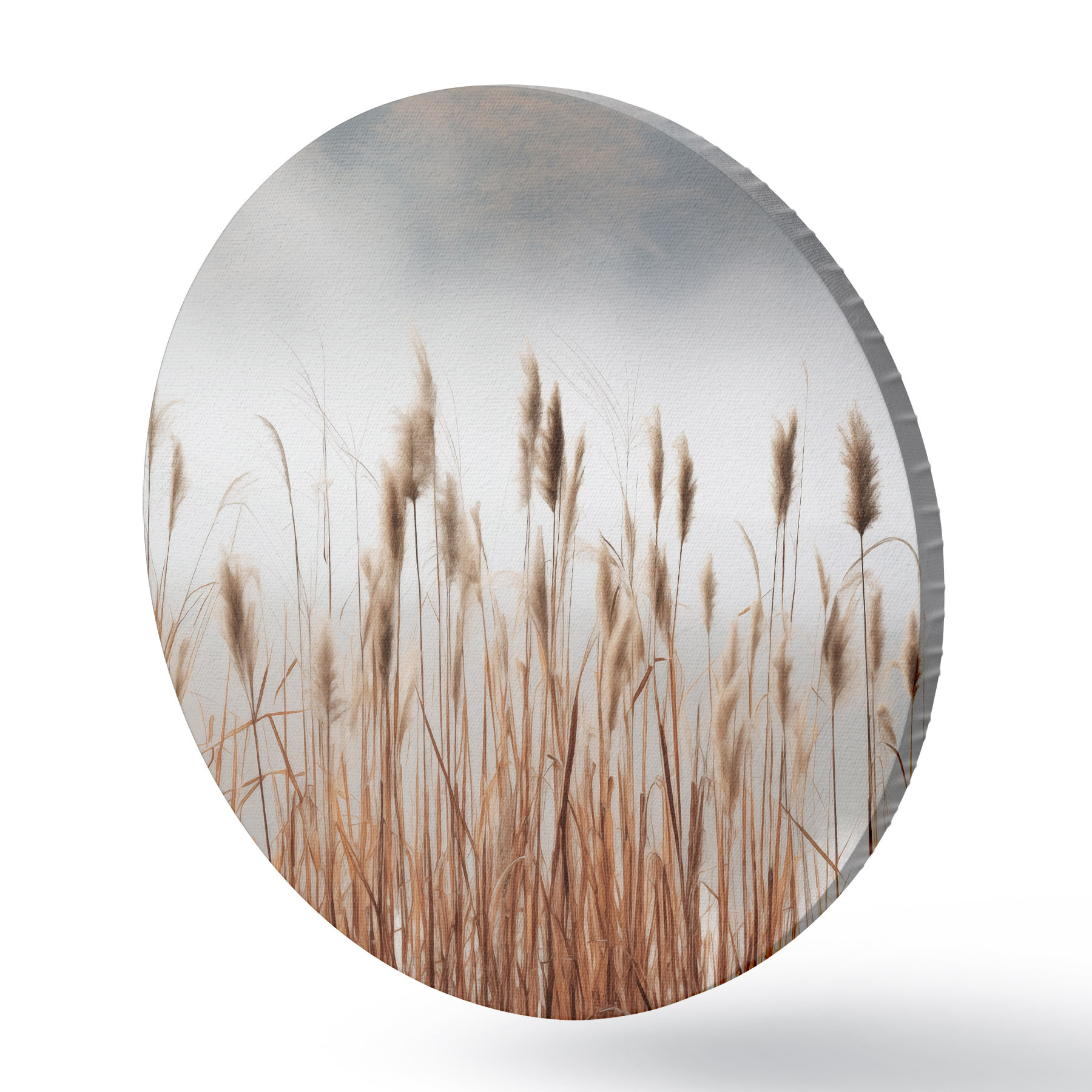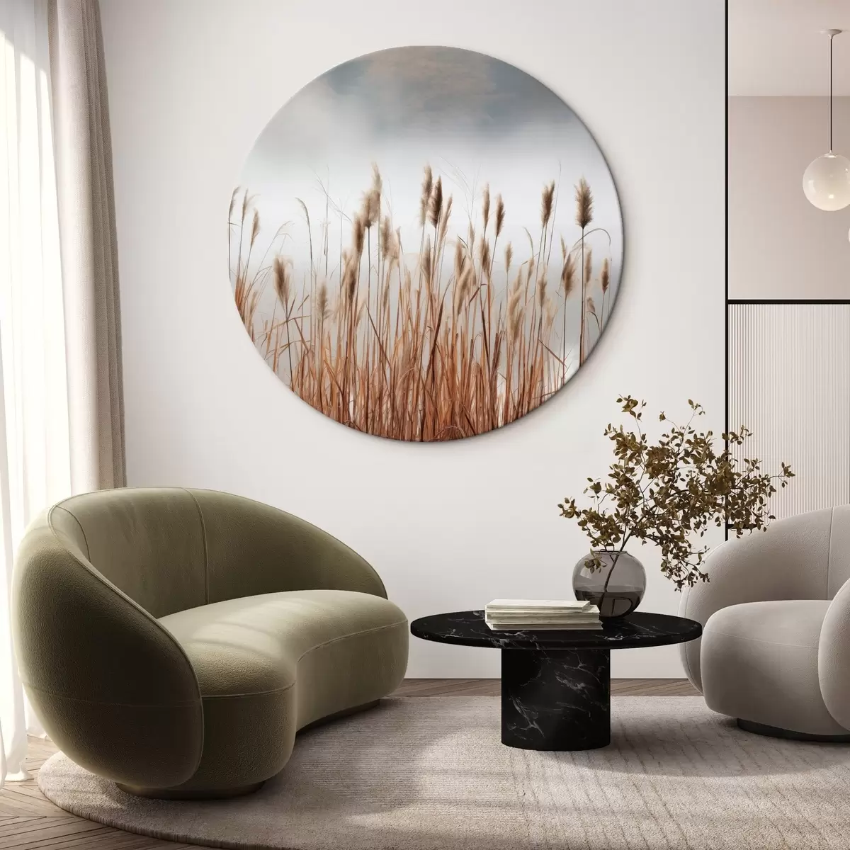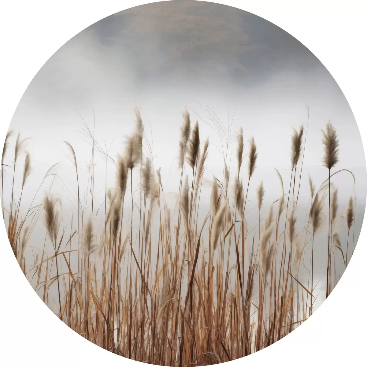 Tableaux rondes De grands roseaux poussant dans un plan d'eau, l'eau reflète les roseaux, arrière-plan brumeux, lumière douce, scène naturelle r46696