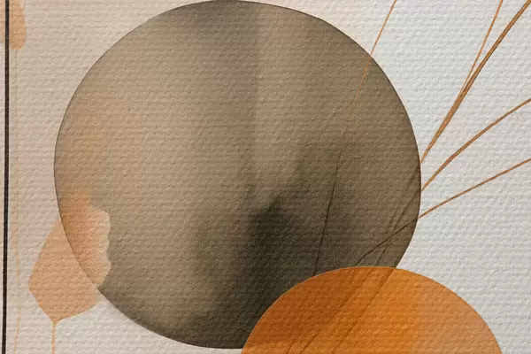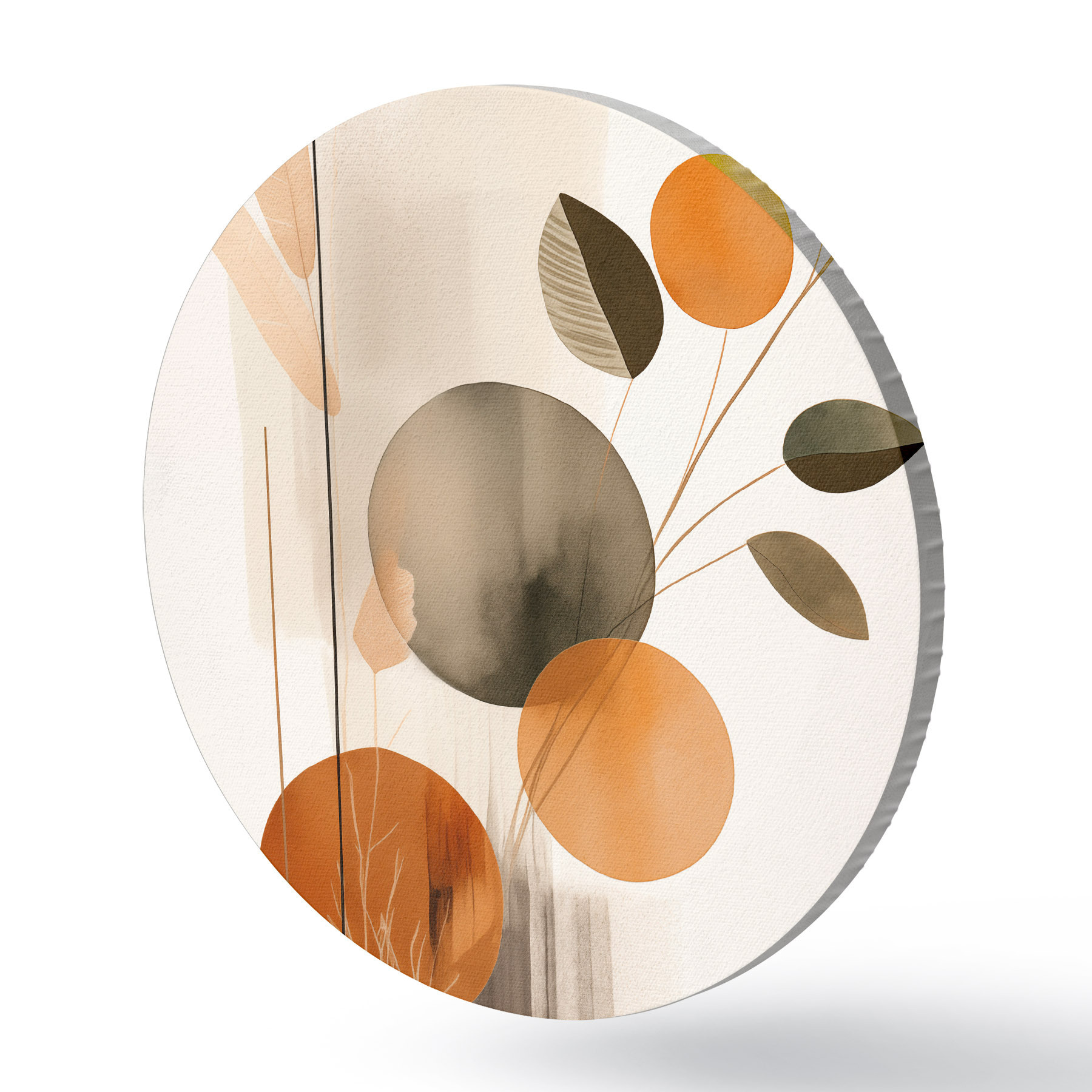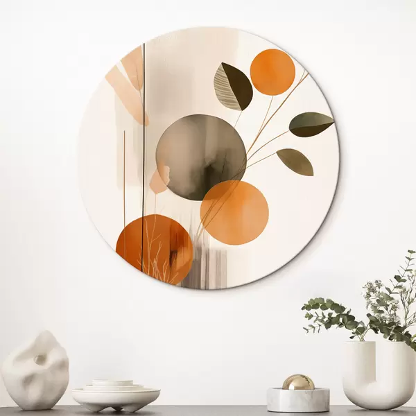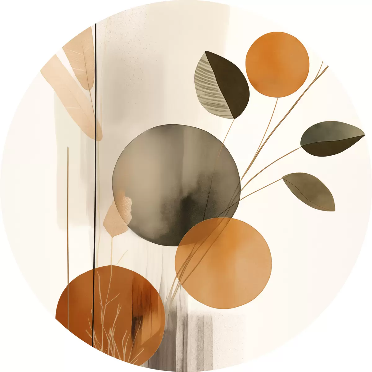 Tableaux rondes Imitation de peinture abstraite avec des cercles orange et gris, des feuilles et des branches, style moderne, effet aquarelle r46697